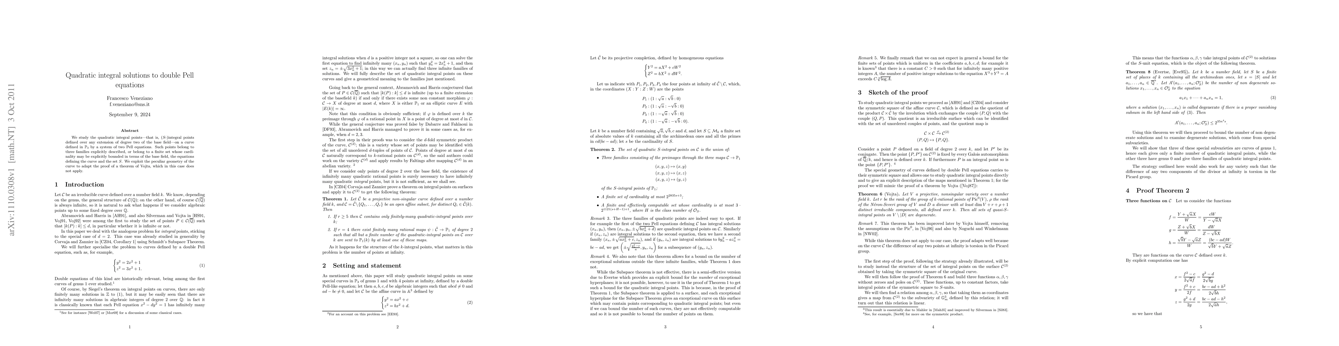 This paper studies quadratic integral points on a curve defined by two Pell equations, identifying three explicit families and potentially bounding the cardinality of other sets, leveraging unique geometric properties to adapt a theorem from Vojta.