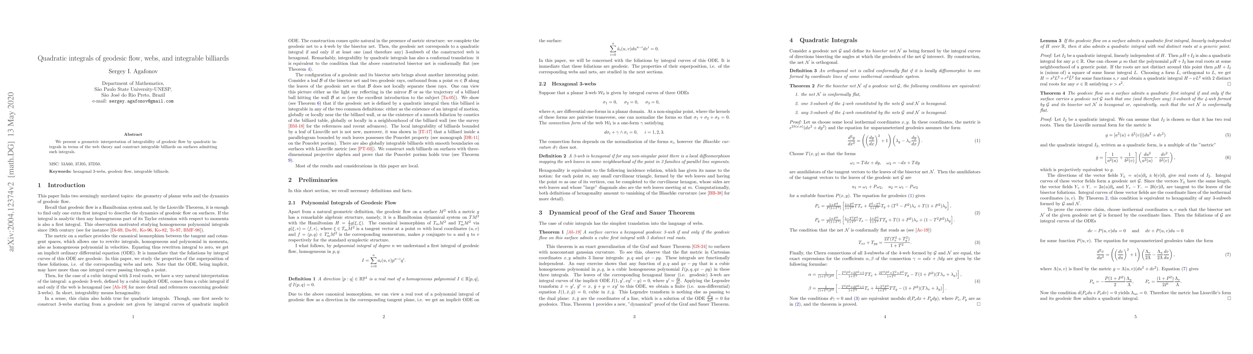We present a geometric interpretation of integrability of geodesic flow by quadratic integrals in terms of the web theory and construct integrable billiards on surfaces admitting such integrals.