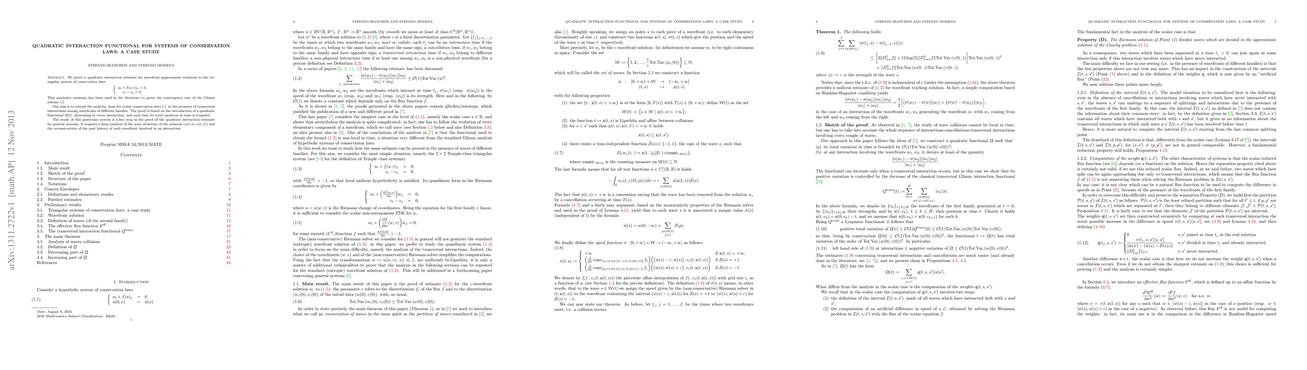 This paper proves a quadratic interaction estimate for wavefront approximate solutions to a triangular system of conservation laws, extending previous analyses for scalar laws to account for transversal interactions. The proof introduces a quadratic functional that decreases at every interaction, ensuring controlled total variation growth.