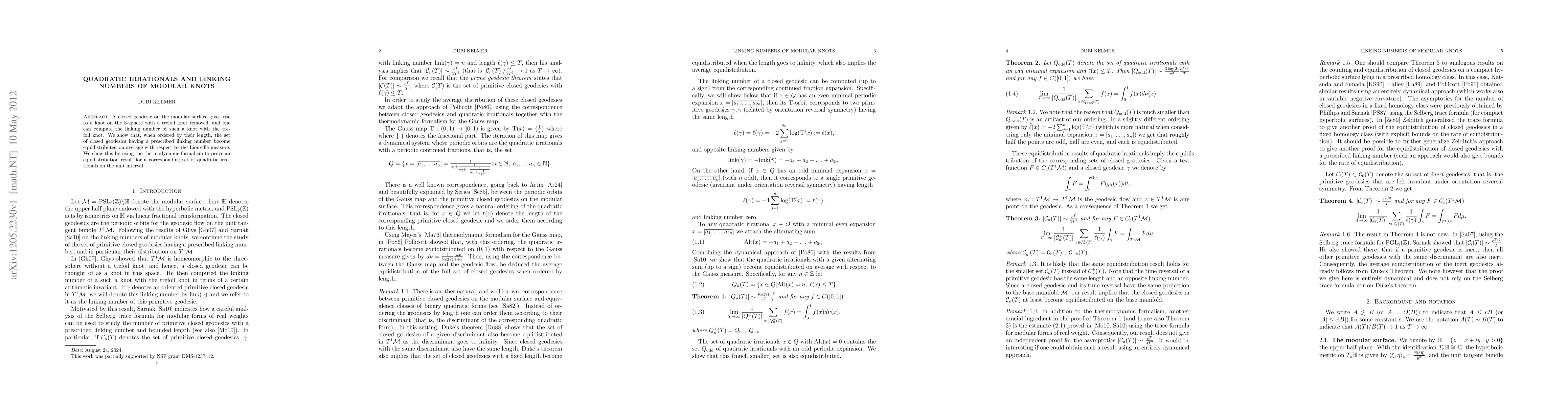 This paper demonstrates that closed geodesics on the modular surface, when ordered by length, equidistribute with respect to the Liouville measure, and uses the thermodynamic formalism to prove this result through a connection to quadratic irrationals and linking numbers of modular knots.