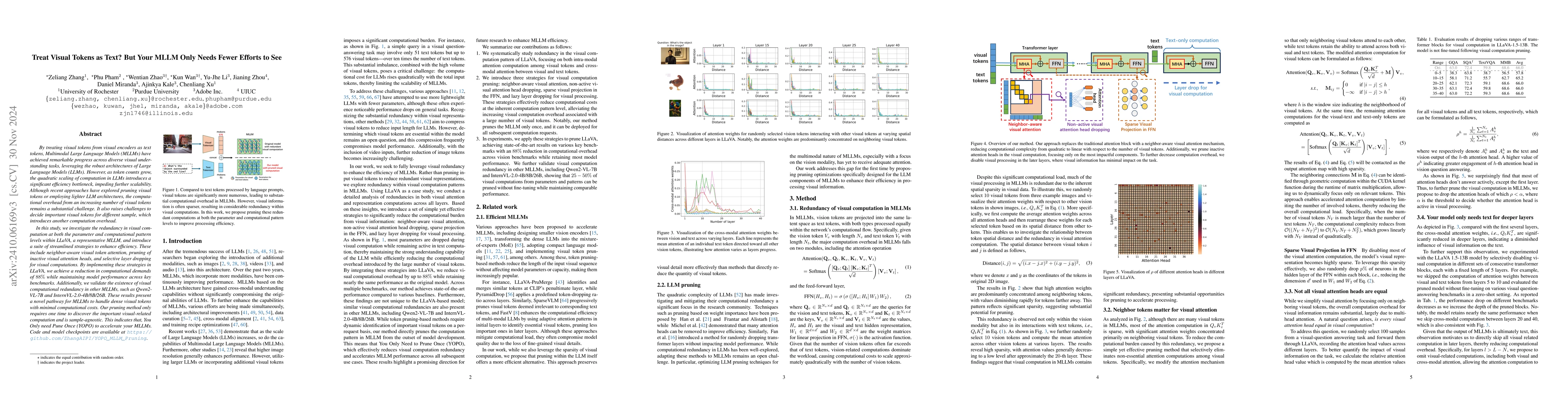 This paper proposes a novel approach to reduce computation in Multimodal Large Language Models (MLLMs) by pruning vision-related computations, thus transforming the computation growth from quadratic to linear with the number of visual tokens. Despite the pruning, the model's performance remains comparable or even improves, suggesting potential for denser visual tokens and architectural improvements.