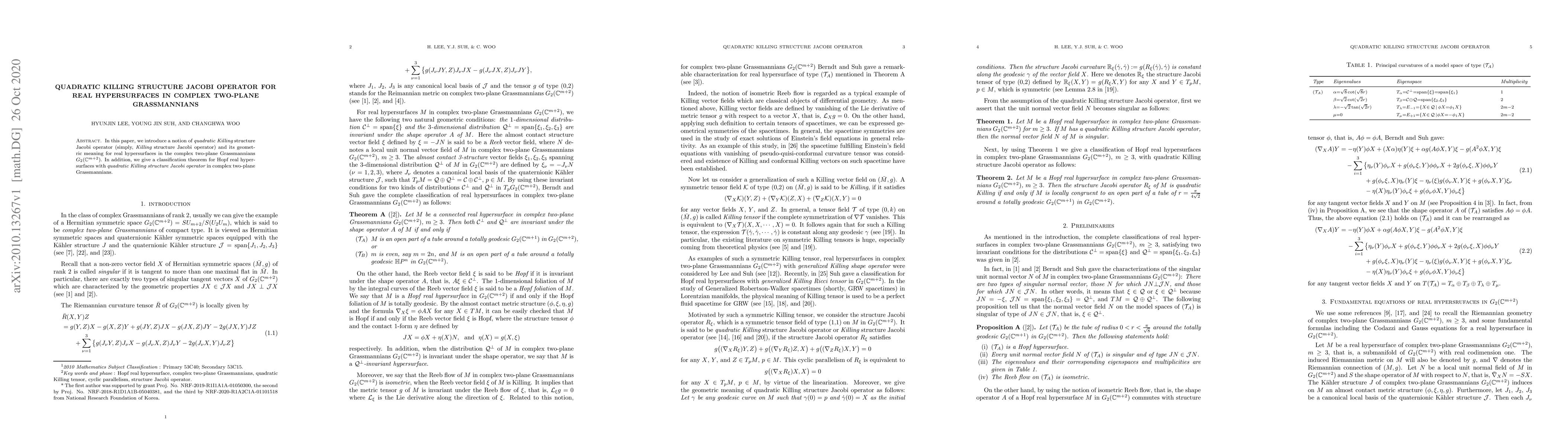 This paper introduces the concept of a quadratic Killing structure Jacobi operator for real hypersurfaces in complex two-plane Grassmannians and discusses its geometric implications. It also presents a classification theorem for Hopf real hypersurfaces with this operator in such settings.