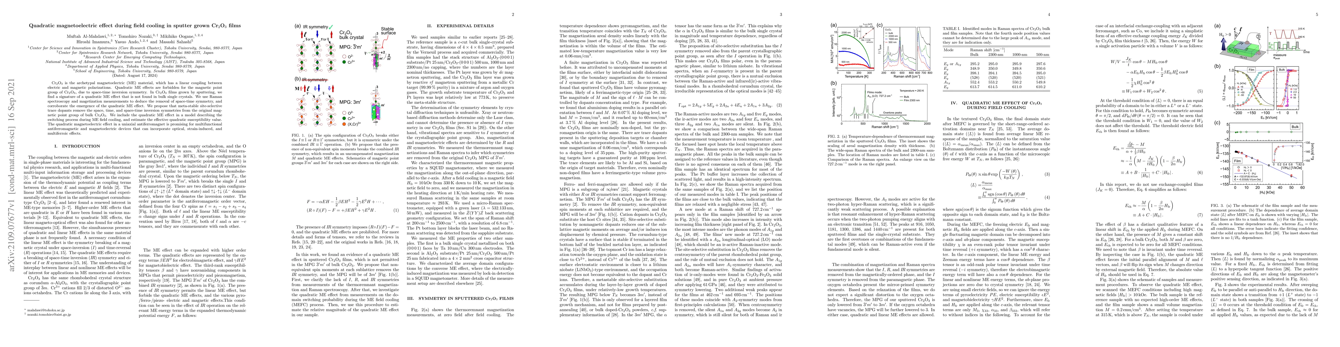 Cr$_2$O$_3$ is the archetypal magnetoelectric (ME) material, which has a linear coupling between electric and magnetic polarizations. Quadratic ME effects are forbidden for the magnetic point group of Cr$_2$O$_3$, due to space-time inversion symmetry. In Cr$_2$O$_3$ films grown by sputtering, we find a signature of a quadratic ME effect that is not found in bulk single crystals. We use Raman spectroscopy and magetization measurements to deduce the removal of space-time symmetry, and corroborate the emergence of the quadratic ME effect. We propose that meta-stable site-selective trace dopants remove the space, time, and space-time inversion symmetries from the original magnetic point group of bulk Cr$_2$O$_3$. We include the quadratic ME effect in a model describing the switching process during ME field cooling, and estimate the effective quadratic susceptibility value. The quadratic magnetoelectric effect in a uniaxial antiferromagnet is promising for multifunctional antiferromagnetic and magnetoelectric devices that can incorporate optical, strain-induced, and multiferroic effects.