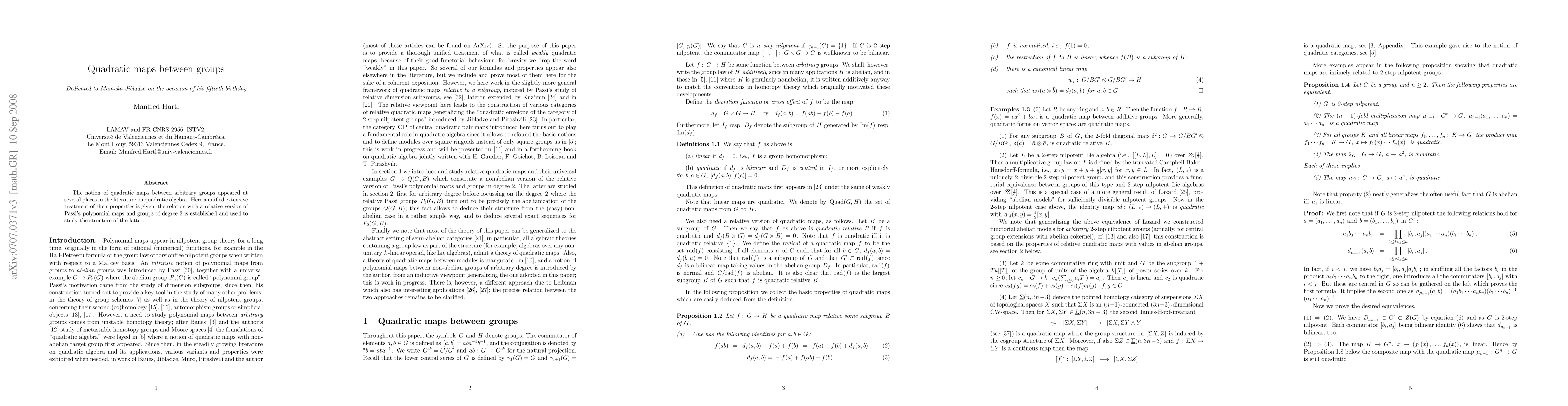 The notion of quadratic maps between arbitrary groups appeared at several places in the literature on quadratic algebra. Here a unified extensive treatment of their properties is given; the relation with a relative version of Passi's polynomial maps and groups of degree 2 is established and used to study the structure of the latter.