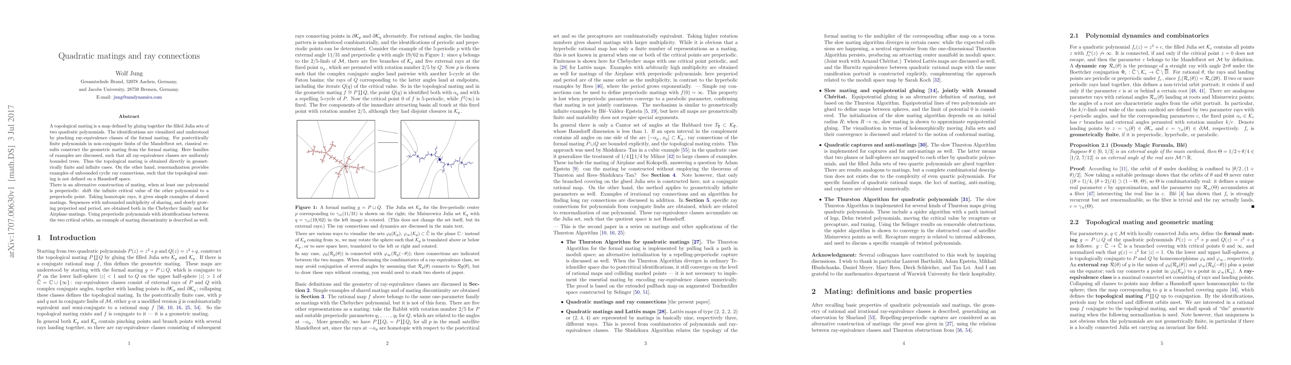 This paper explores topological matings derived from quadratic polynomials, emphasizing ray connections and their implications. It discusses geometrically finite and infinite cases with bounded ray-equivalence classes, contrasting with unbounded cyclic connections seen via renormalization. It also examines preperiodic polynomials and their shared matings, including examples of mating discontinuity.
