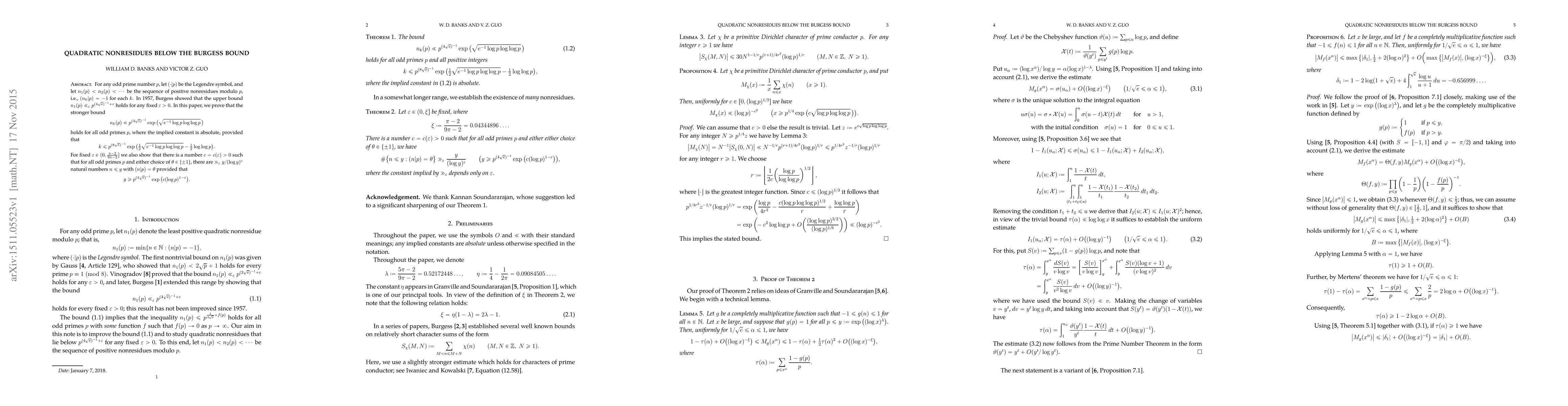 This paper establishes a stronger upper bound on quadratic nonresidues below the Burgess bound for any odd prime $p$, showing that $n_k(p)$ is significantly smaller than previously thought. Additionally, it demonstrates that for sufficiently large $y$, there are many natural numbers $n$ that are quadratic residues or nonresidues modulo $p$.