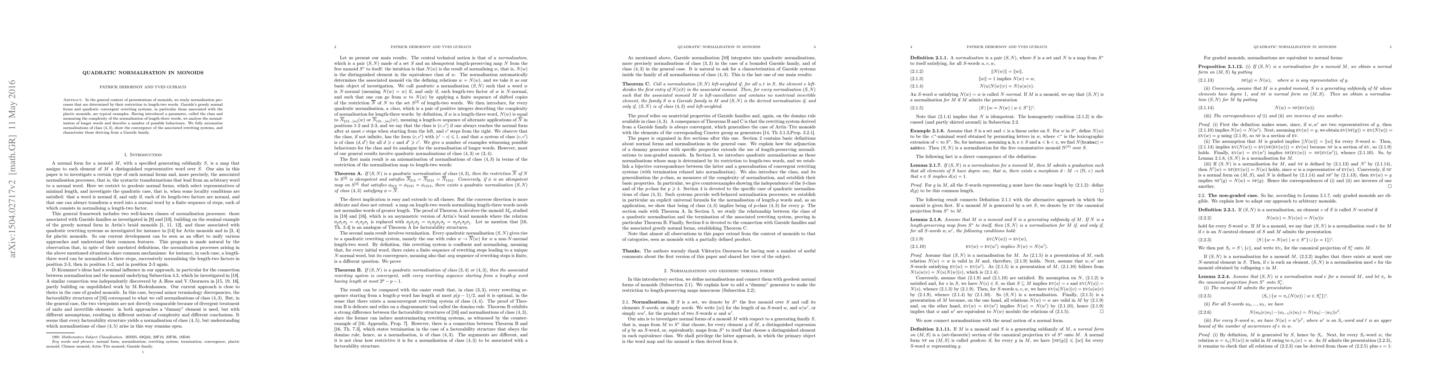 In the general context of presentations of monoids, we study normalisation processes that are determined by their restriction to length-two words. Garside's greedy normal forms and quadratic convergent rewriting systems, in particular those associated with the plactic monoids, are typical examples. Having introduced a parameter, called the class and measuring the complexity of the normalisation of length-three words, we analyse the normalisation of longer words and describe a number of possible behaviours. We fully axiomatise normalisations of class (4, 3), show the convergence of the associated rewriting systems, and characterise those deriving from a Garside family.