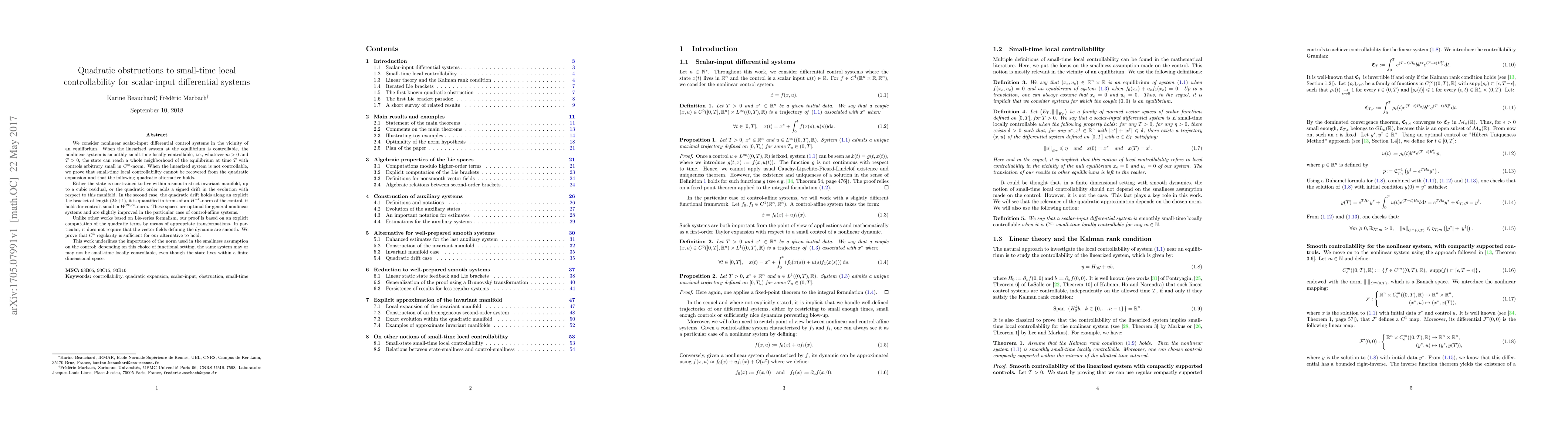 This paper investigates small-time local controllability for nonlinear scalar-input differential systems near an equilibrium. It proves that quadratic terms obstruct controllability when the linearized system is not controllable, presenting a quadratic alternative that either confines the state to a strict invariant manifold or introduces a quadratic drift quantified by the control's $H^{-k}$-norm. The proof is explicit and does not require smooth vector fields, only $C^3$ regularity.
