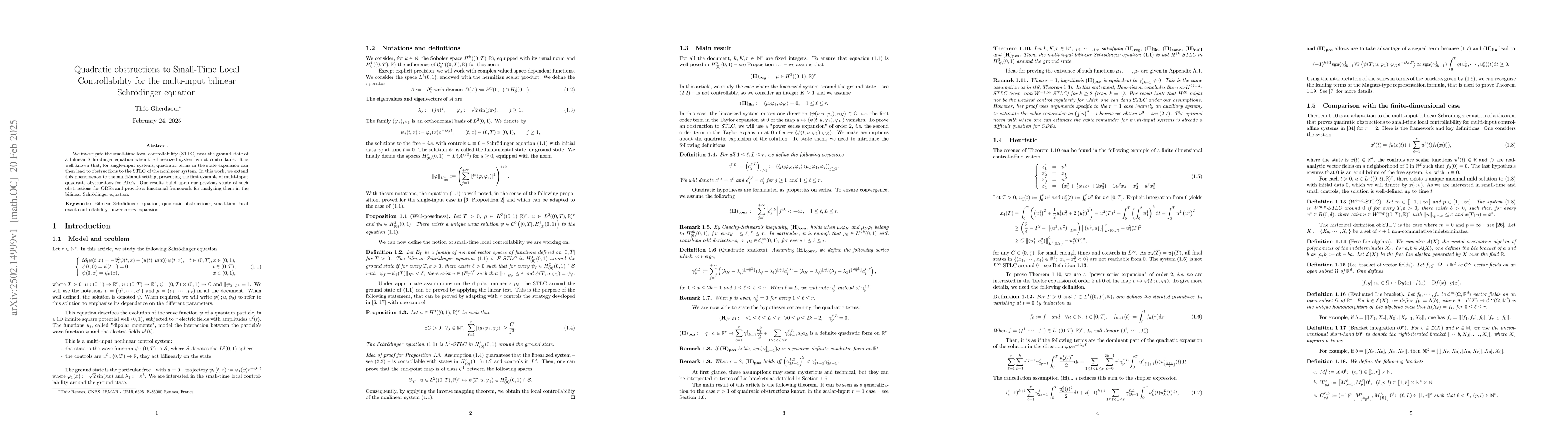 Summary: This paper explores small-time local controllability for multi-input bilinear Schrödinger equations where the linearized system is uncontrollable. It introduces the first example of multi-input quadratic obstructions to controllability for PDEs, extending similar phenomena observed in ODEs and providing a functional framework for analysis.