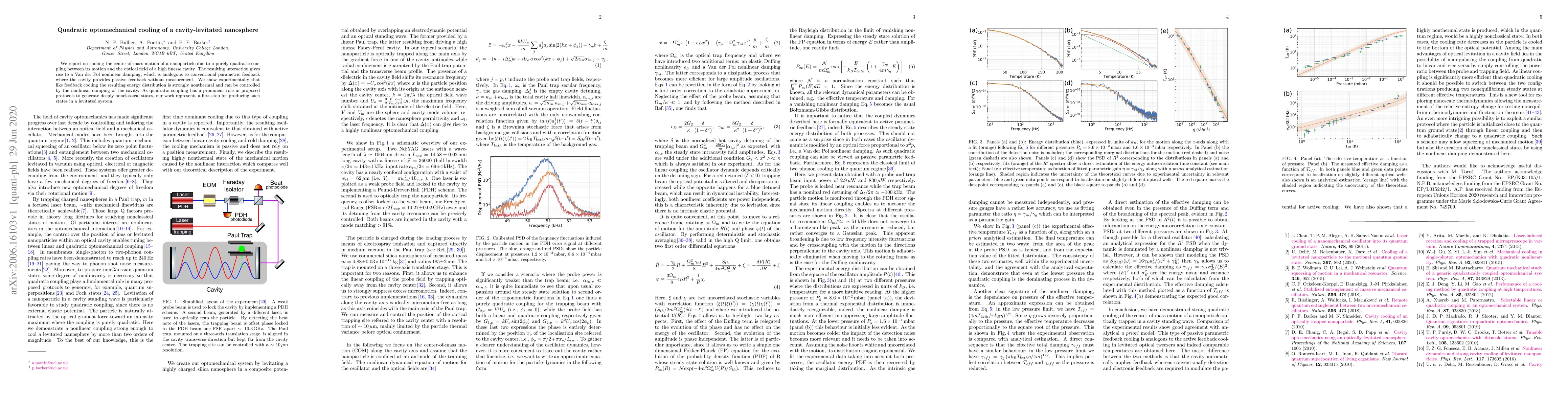 This paper demonstrates the cooling of a nanoparticle's motion via quadratic optomechanical coupling in a high-finesse cavity, resulting in a Van der Pol nonlinear damping analogous to feedback cooling. The study shows that this method can produce nonthermal energy distributions and represents a foundational step towards generating deeply nonclassical states in levitated systems.