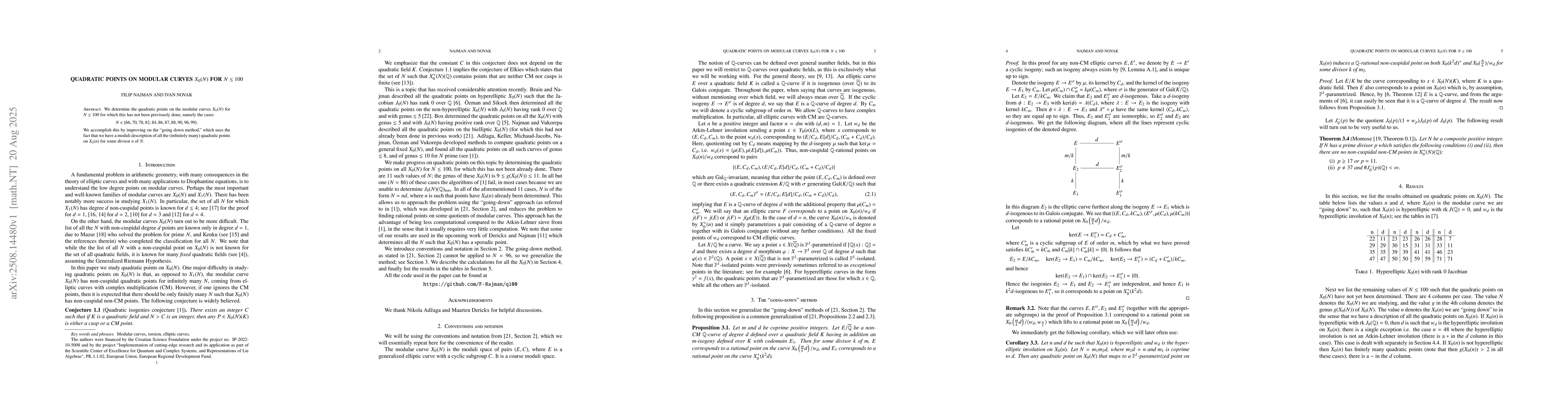 The research improves the 'going down method' to determine quadratic points on modular curves $X_0(N)$ for $N \leq 100$, focusing on cases $N \in \{66, 70, 78, 82, 84, 86, 87, 88, 90, 96, 99\}$ where previous work was insufficient.