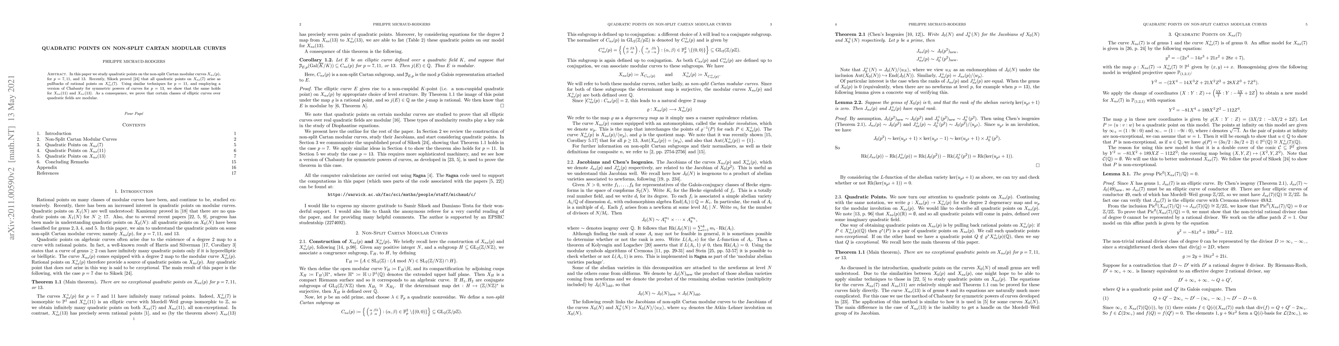 In this paper we study quadratic points on the non-split Cartan modular curves $X_{ns}(p)$, for $p = 7, 11,$ and $13$. Recently, Siksek proved that all quadratic points on $X_{ns}(7)$ arise as pullbacks of rational points on $X_{ns}^+(7)$. Using similar techniques for $p=11$, and employing a version of Chabauty for symmetric powers of curves for $p=13$, we show that the same holds for $X_{ns}(11)$ and $X_{ns}(13)$. As a consequence, we prove that certain classes of elliptic curves over quadratic fields are modular.