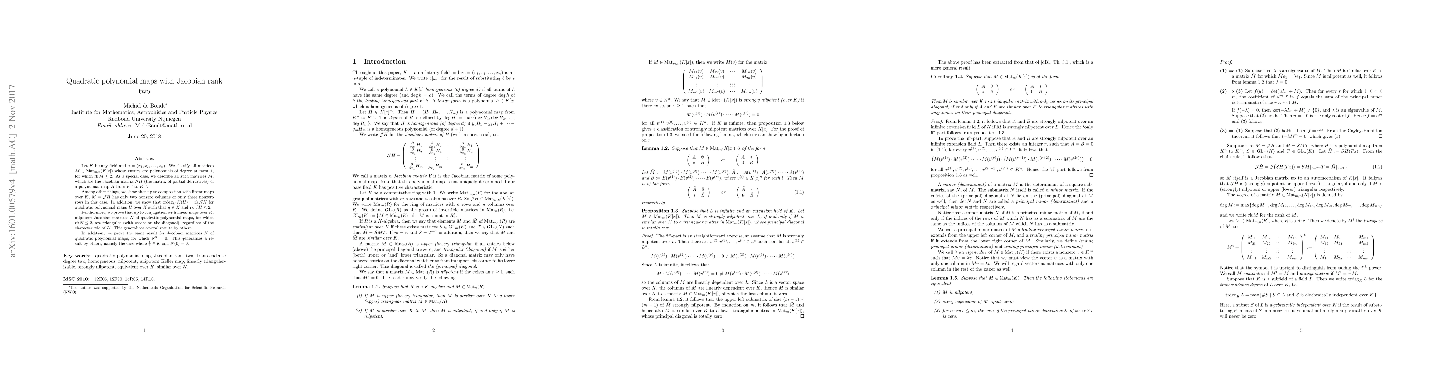 This paper classifies matrices of Jacobian rank ≤ 2 for quadratic polynomial maps, showing that such matrices have only two nonzero columns or three nonzero rows. It also proves that the transcendence degree equals the rank for these maps, and that nilpotent Jacobian matrices of rank ≤ 2 are triangular regardless of field characteristics.