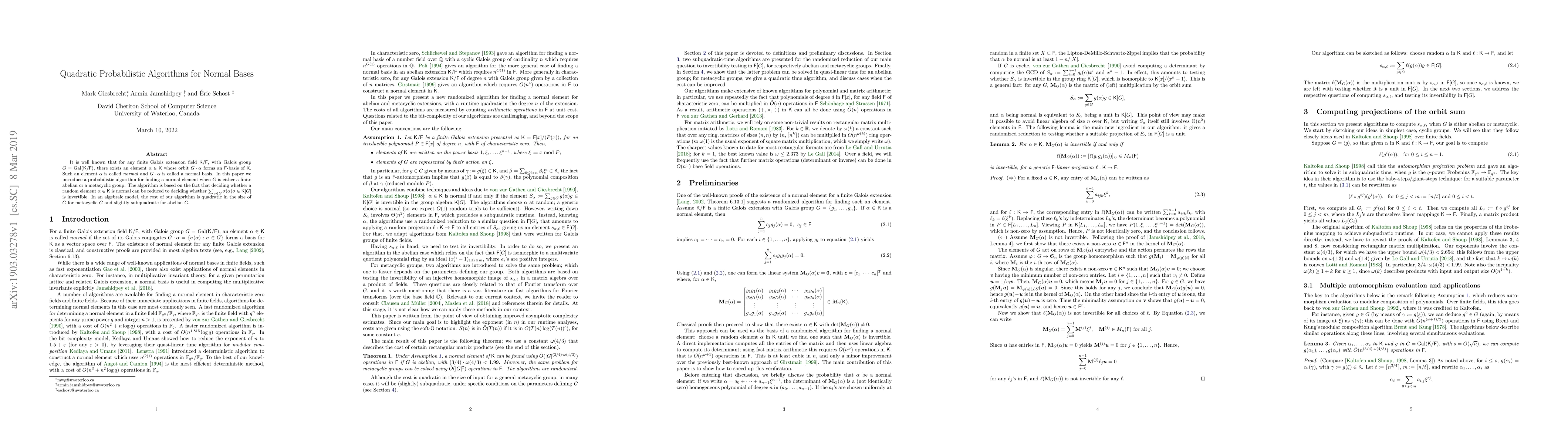 It is well known that for any finite Galois extension field $K/F$, with Galois group $G = \mathrm{Gal}(K/F)$, there exists an element $\alpha \in K$ whose orbit $G\cdot\alpha$ forms an $F$-basis of $K$. Such an element $\alpha$ is called \emph{normal} and $G\cdot\alpha$ is called a normal basis. In this paper we introduce a probabilistic algorithm for finding a normal element when $G$ is either a finite abelian or a metacyclic group. The algorithm is based on the fact that deciding whether a random element $\alpha \in K$ is normal can be reduced to deciding whether $\sum_{\sigma \in G} \sigma(\alpha)\sigma \in K[G]$ is invertible. In an algebraic model, the cost of our algorithm is quadratic in the size of $G$ for metacyclic $G$ and slightly subquadratic for abelian $G$.