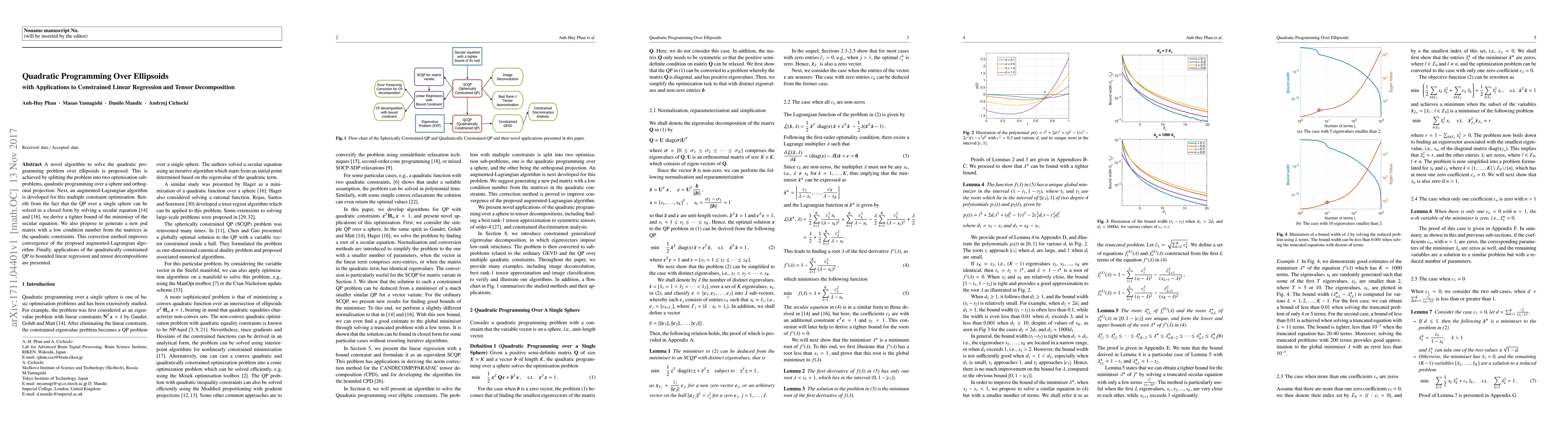 This paper proposes a novel algorithm for solving quadratic programming over ellipsoids by decomposing it into quadratic programming over a sphere and orthogonal projection, using an augmented-Lagrangian approach. It also introduces a method to generate a more stable positive semi-definite matrix for improved convergence, and applies the method to constrained linear regression and tensor decomposition.