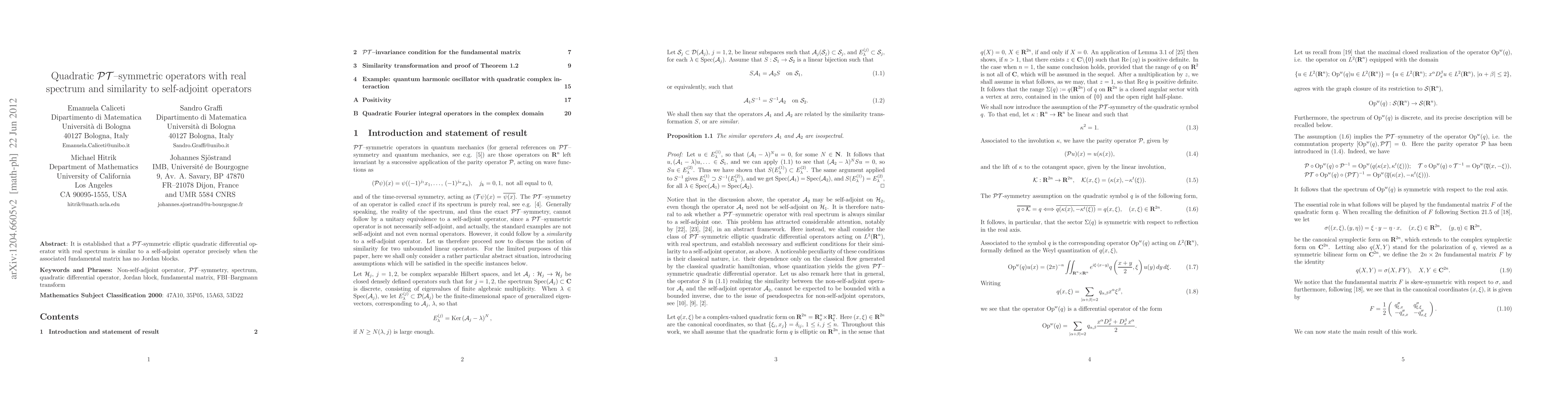 Summary: The paper proves that a PT-symmetric elliptic quadratic differential operator has a real spectrum and is similar to a self-adjoint operator if and only if its associated fundamental matrix lacks Jordan blocks. This establishes a condition for PT-symmetry equivalence to self-adjointness.