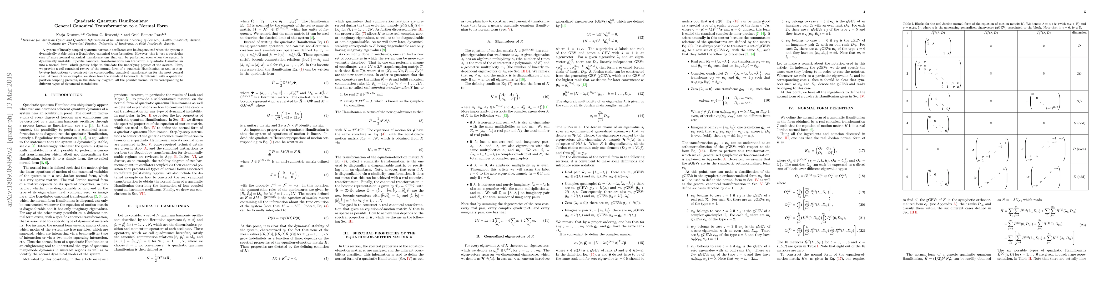 This paper reviews general canonical transformations for quadratic quantum Hamiltonians, providing a method to transform them into a normal form regardless of dynamical stability. It offers step-by-step instructions for constructing these transformations and illustrates the approach with examples, including the two-mode Hamiltonian with quadratic position coupling.