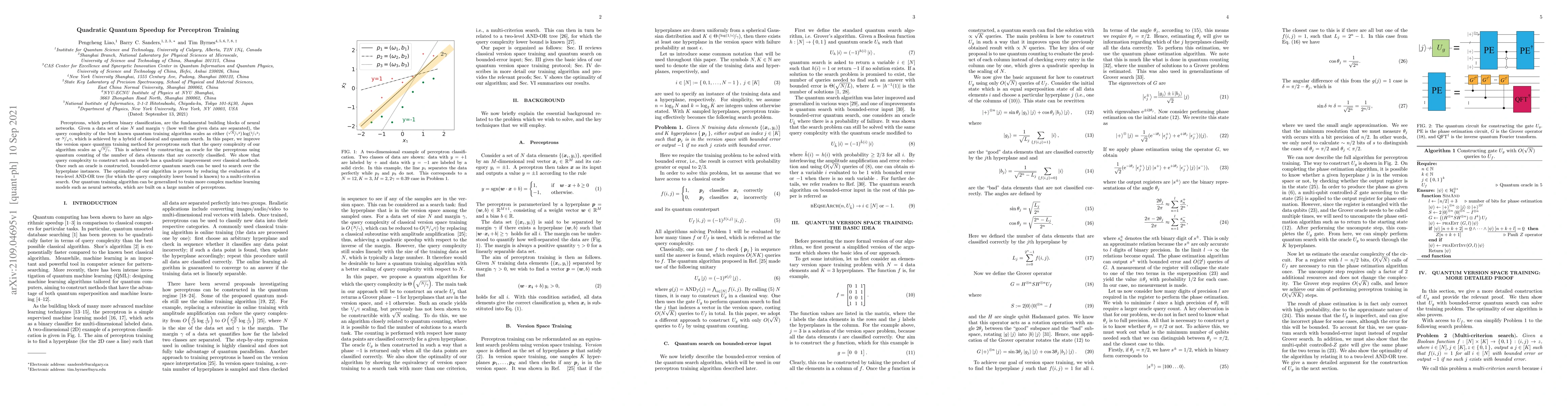 Perceptrons, which perform binary classification, are the fundamental building blocks of neural networks. Given a data set of size~$N$ and margin~$\gamma$ (how well the given data are separated), the query complexity of the best-known quantum training algorithm scales as either $(\nicefrac{\sqrt{N}}{\gamma^2})\log(\nicefrac1{\gamma^2)}$ or $\nicefrac{N}{\sqrt{\gamma}}$, which is achieved by a hybrid of classical and quantum search. In this paper, we improve the version space quantum training method for perceptrons such that the query complexity of our algorithm scales as $\sqrt{\nicefrac{N}{\gamma}}$. This is achieved by constructing an oracle for the perceptrons using quantum counting of the number of data elements that are correctly classified. We show that query complexity to construct such an oracle has a quadratic improvement over classical methods. Once such an oracle is constructed, bounded-error quantum search can be used to search over the hyperplane instances. The optimality of our algorithm is proven by reducing the evaluation of a two-level AND-OR tree (for which the query complexity lower bound is known) to a multi-criterion search. Our quantum training algorithm can be generalized to train more complex machine learning models such as neural networks, which are built on a large number of perceptrons.