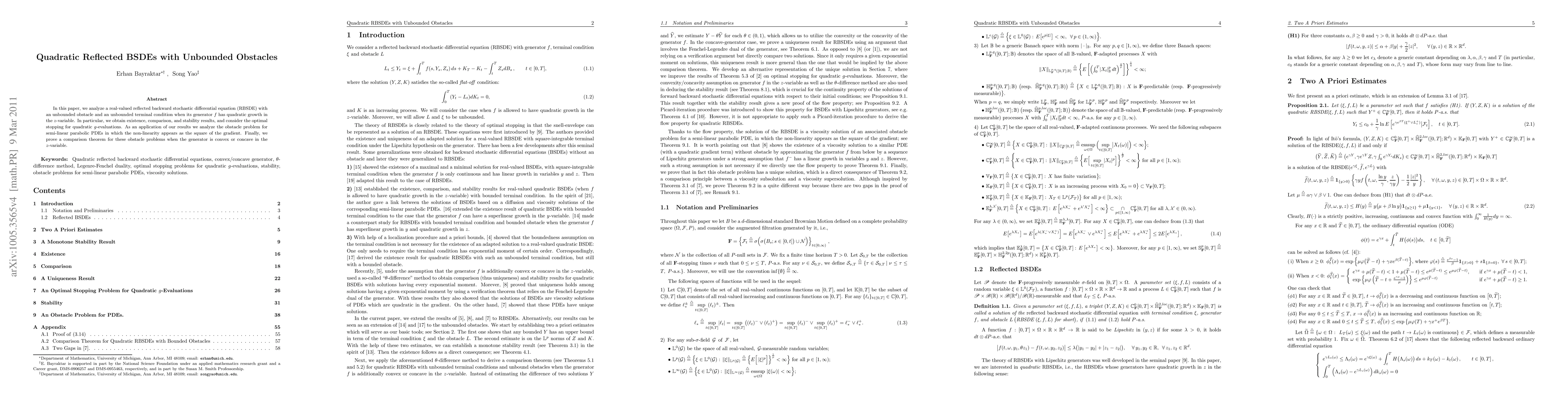 In this paper, we analyze a real-valued reflected backward stochastic differential equation (RBSDE) with an unbounded obstacle and an unbounded terminal condition when its generator $f$ has quadratic growth in the $z$-variable. In particular, we obtain existence, comparison, and stability results, and consider the optimal stopping for quadratic $g$-evaluations. As an application of our results we analyze the obstacle problem for semi-linear parabolic PDEs in which the non-linearity appears as the square of the gradient. Finally, we prove a comparison theorem for these obstacle problems when the generator is convex or concave in the $z$-variable.