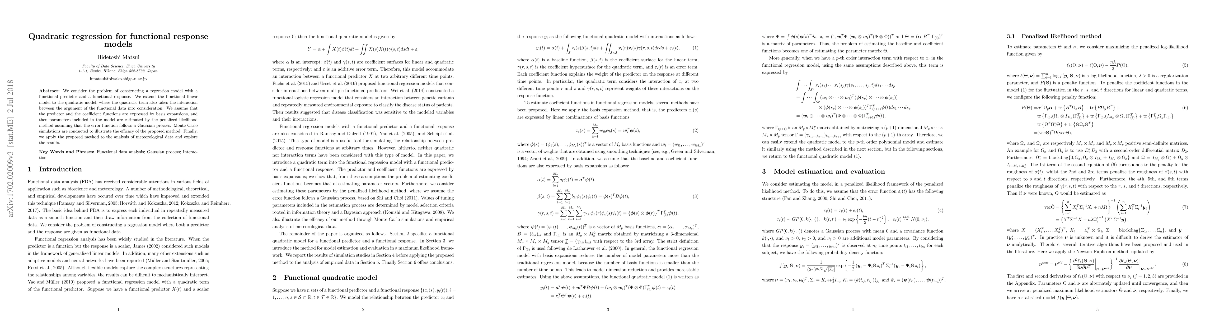 This paper proposes a quadratic regression model for functional predictors and responses, incorporating interaction terms. The model parameters are estimated using penalized likelihood with basis expansions, and the method's effectiveness is demonstrated through simulations and an application to meteorological data analysis.