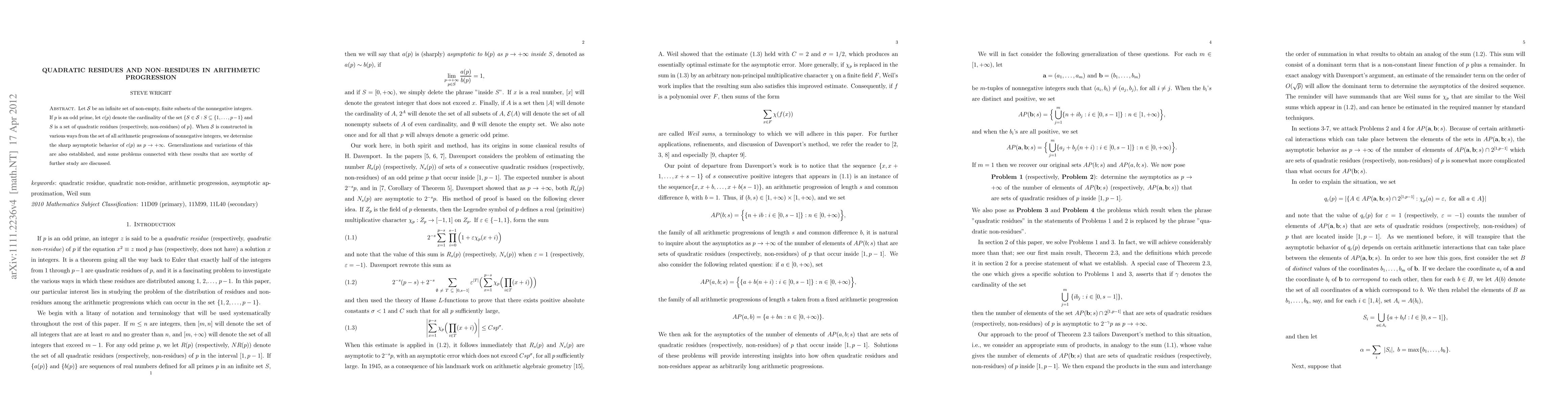 Let S be an infinite set of non-empty, finite subsets of the nonnegative integers. If p is an odd prime, let c(p) denote the cardinality of the set {T {\in} S : T {\subseteq} {1,...,p-1} and T is a set of quadratic residues (respectively, non-residues) of p}. When S is constructed in various ways from the set of all arithmetic progressions of nonnegative integers, we determine the sharp asymptotic behavior of c(p) as p {\to} +{\infty}. Generalizations and variations of this are also established, and some problems connected with these results that are worthy of further study are discussed.