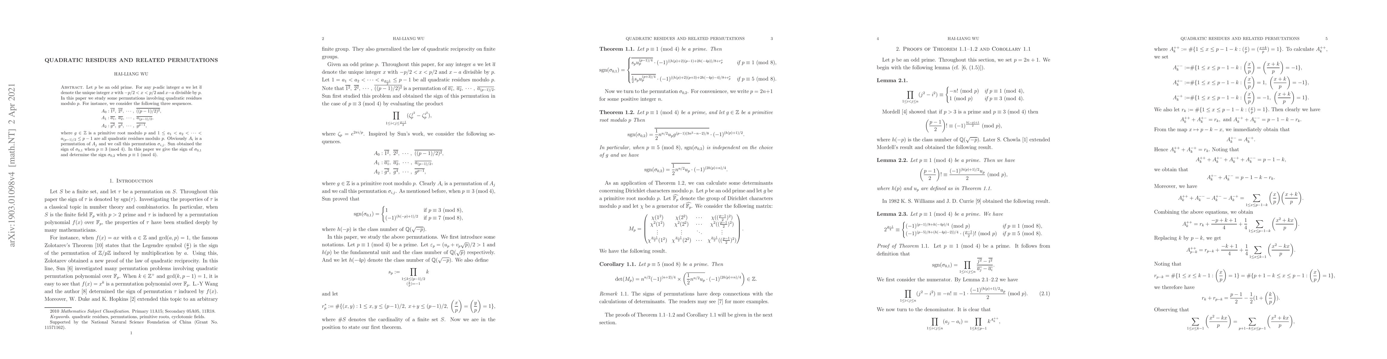 This paper explores permutations involving quadratic residues modulo an odd prime $p$, focusing on three sequences related to quadratic residues and their permutations. It determines the sign of the permutation $\sigma_{0,1}$ and $\sigma_{0,2}$ for specific prime residue classes.