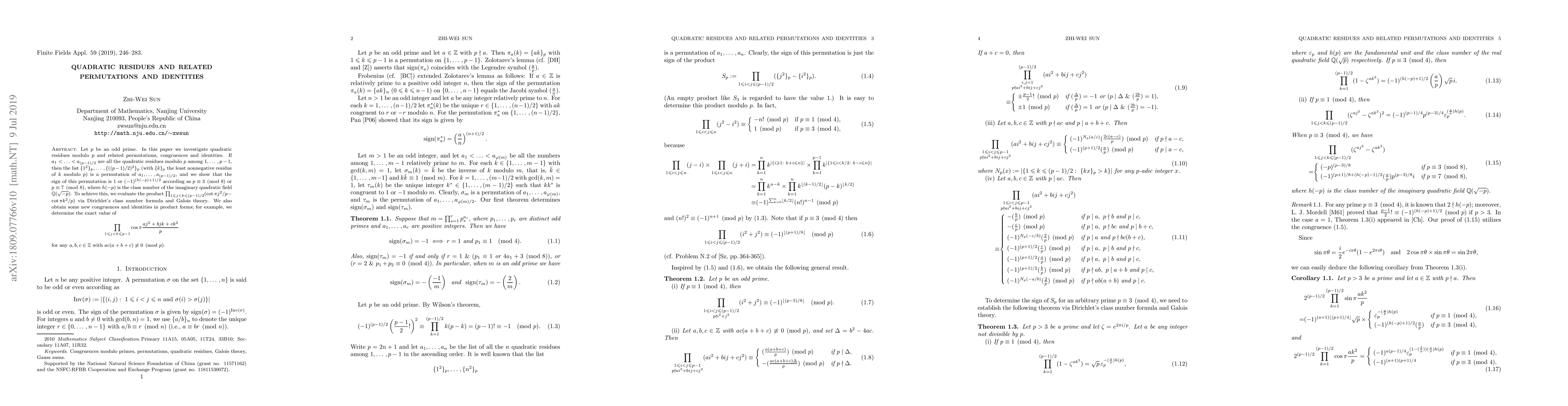 This paper explores quadratic residues modulo an odd prime $p$ and their associated permutations, proving that $\{1^2\}_p,\ldots,\{((p-1)/2)^2\}_p$ permutes the quadratic residues $a_1,\ldots,a_{(p-1)/2}$. It also evaluates a product involving cotangents and derives new identities for sine and cosine functions.