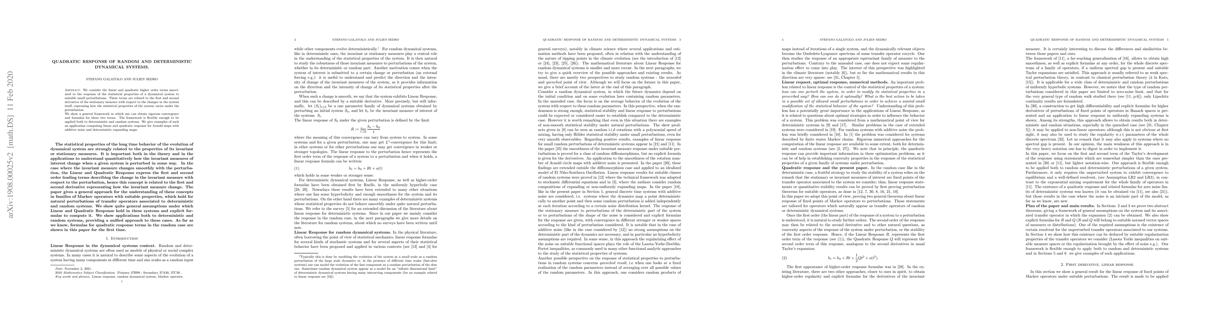 This paper develops a general framework for rigorously determining linear and quadratic response terms in both deterministic and random dynamical systems, showing how statistical properties change under small perturbations. It applies this framework to Arnold maps with noise and deterministic expanding maps, providing concrete examples of the method.