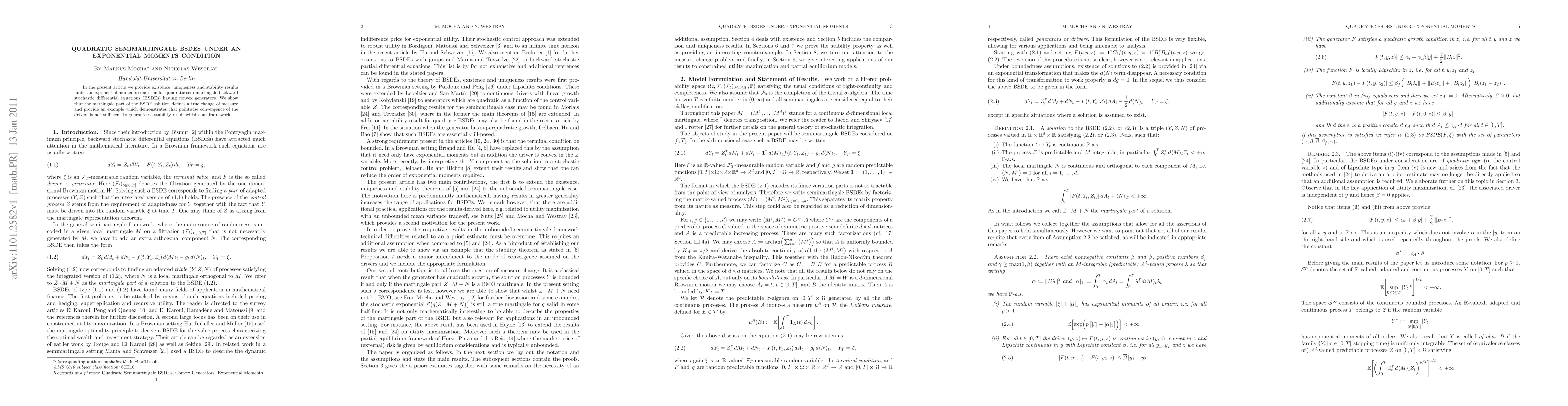 This paper establishes existence, uniqueness, and stability results for quadratic semimartingale backward stochastic differential equations under an exponential moments condition, showing that the martingale part defines a true change of measure.
