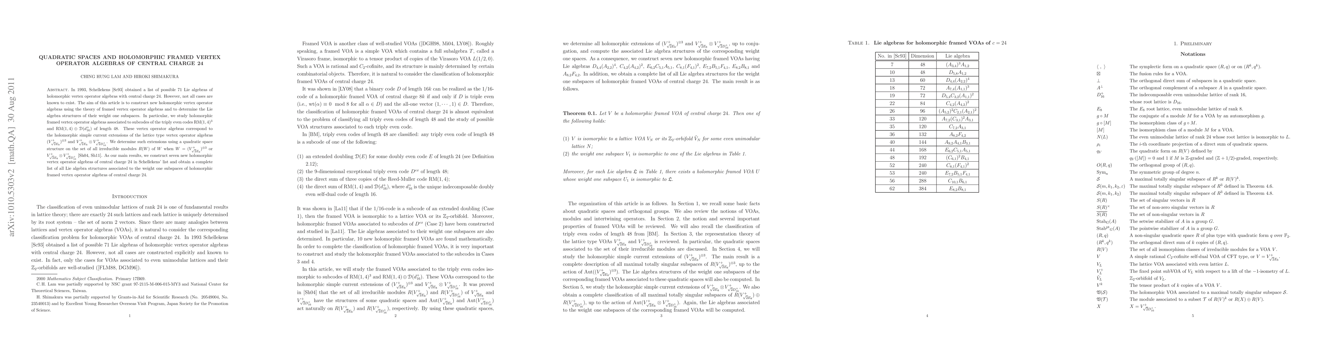 In 1993, Schellekens obtained a list of possible 71 Lie algebras of holomorphic vertex operator algebras with central charge 24. However, not all cases are known to exist. The aim of this article is to construct new holomorphic vertex operator algebras using the theory of framed vertex operator algebras and to determine the Lie algebra structures of their weight one subspaces. In particular, we study holomorphic framed vertex operator algebras associated to subcodes of the triply even codes $\RM(1,4)^3$ and $\RM(1,4)\oplus \EuD(d_{16}^+)$ of length 48. These vertex operator algebras correspond to the holomorphic simple current extensions of the lattice type vertex operator algebras $(V_{\sqrt{2}E_8}^+)^{\otimes 3}$ and $V_{\sqrt{2}E_8}^+\otimes V_{\sqrt{2}D_{16}^+}^+$. We determine such extensions using a quadratic space structure on the set of all irreducible modules $R(W)$ of $W$ when $W= (V_{\sqrt{2}E_8}^+)^{\otimes 3}$ or $V_{\sqrt{2}E_8}^+\otimes V_{\sqrt{2}D_{16}^+}^+$. As our main results, we construct seven new holomorphic vertex operator algebras of central charge 24 in Schellekens' list and obtain a complete list of all Lie algebra structures associated to the weight one subspaces of holomorphic framed vertex operator algebras of central charge 24.