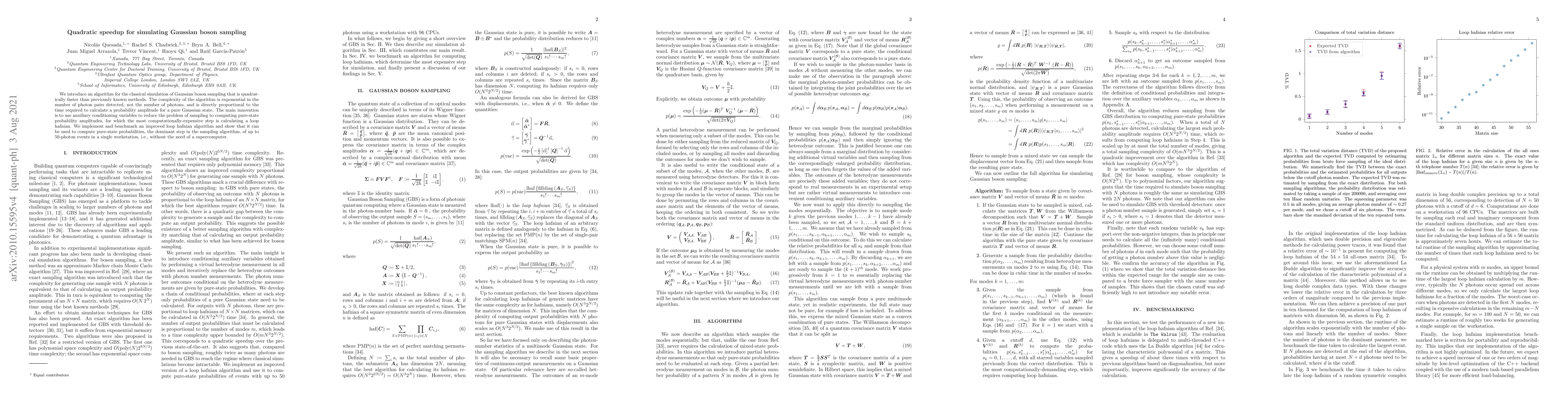 This paper presents a quadratically faster algorithm for simulating Gaussian boson sampling, reducing complexity from the number of photons to the number of detected photon pairs. The key innovation involves using auxiliary variables to compute pure-state probability amplitudes, significantly speeding up the calculation of loop hafnians.