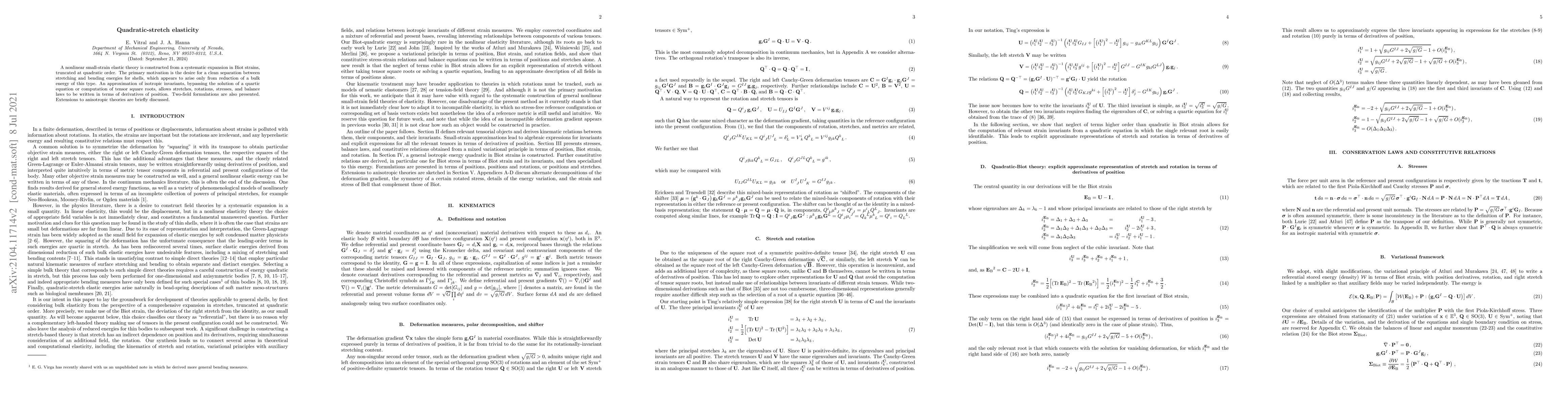 A nonlinear small-strain elastic theory is constructed from a systematic expansion in Biot strains, truncated at quadratic order. The primary motivation is the desire for a clean separation between stretching and bending energies for shells, which appears to arise only from reduction of a bulk energy of this type. An approximation of isotropic invariants, bypassing the solution of a quartic equation or computation of tensor square roots, allows stretches, rotations, stresses, and balance laws to be written in terms of derivatives of position. Two-field formulations are also presented. Extensions to anisotropic theories are briefly discussed.