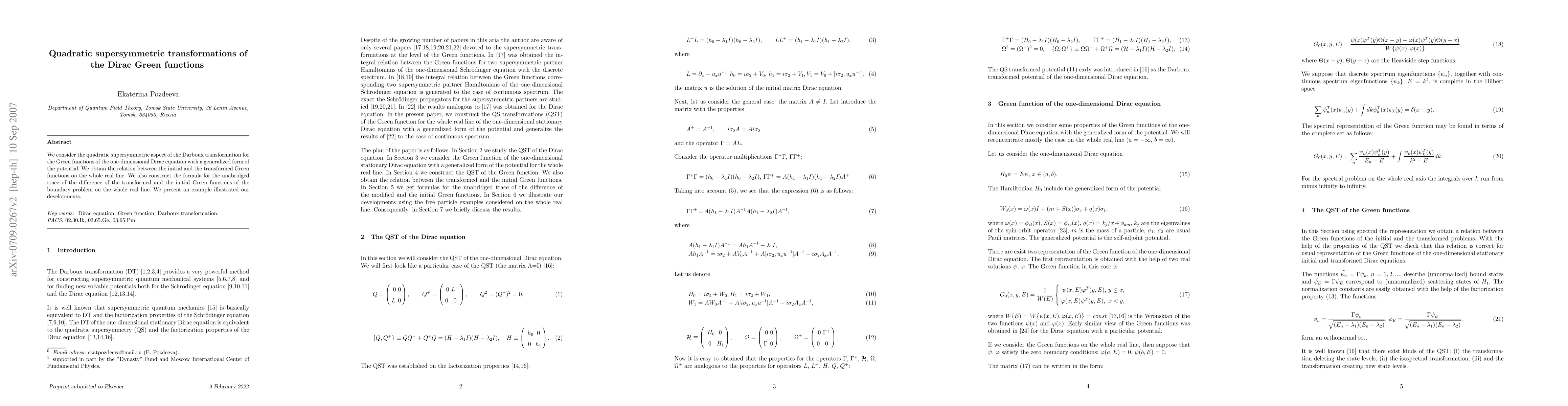 We consider the quadratic supersymmetric aspect of the Darboux transformation for the Green functions of the one-dimensional Dirac equation with a generalized form of the potential. We obtain the relation between the initial and the transformed Green functions on the whole real line. We also construct the formula for the unabridged trace of the difference of the transformed and the initial Green functions of the boundary problem on the whole real line. We present an example illustrated our developments.