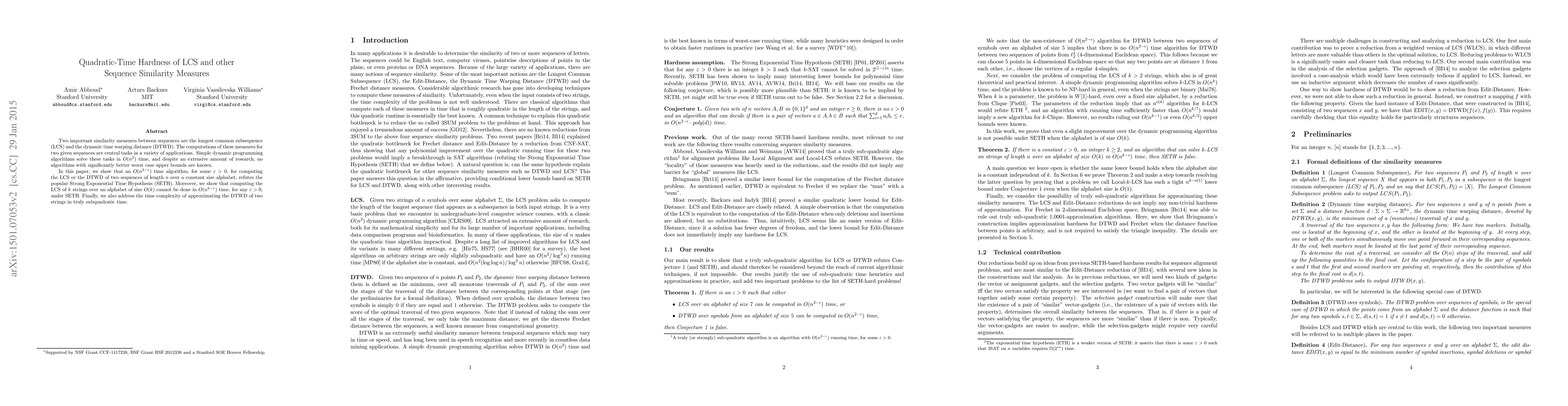 Two important similarity measures between sequences are the longest common subsequence (LCS) and the dynamic time warping distance (DTWD). The computations of these measures for two given sequences are central tasks in a variety of applications. Simple dynamic programming algorithms solve these tasks in $O(n^2)$ time, and despite an extensive amount of research, no algorithms with significantly better worst case upper bounds are known. In this paper, we show that an $O(n^{2-\epsilon})$ time algorithm, for some $\epsilon>0$, for computing the LCS or the DTWD of two sequences of length $n$ over a constant size alphabet, refutes the popular Strong Exponential Time Hypothesis (SETH). Moreover, we show that computing the LCS of $k$ strings over an alphabet of size $O(k)$ cannot be done in $O(n^{k-\epsilon})$ time, for any $\epsilon>0$, under SETH. Finally, we also address the time complexity of approximating the DTWD of two strings in truly subquadratic time.