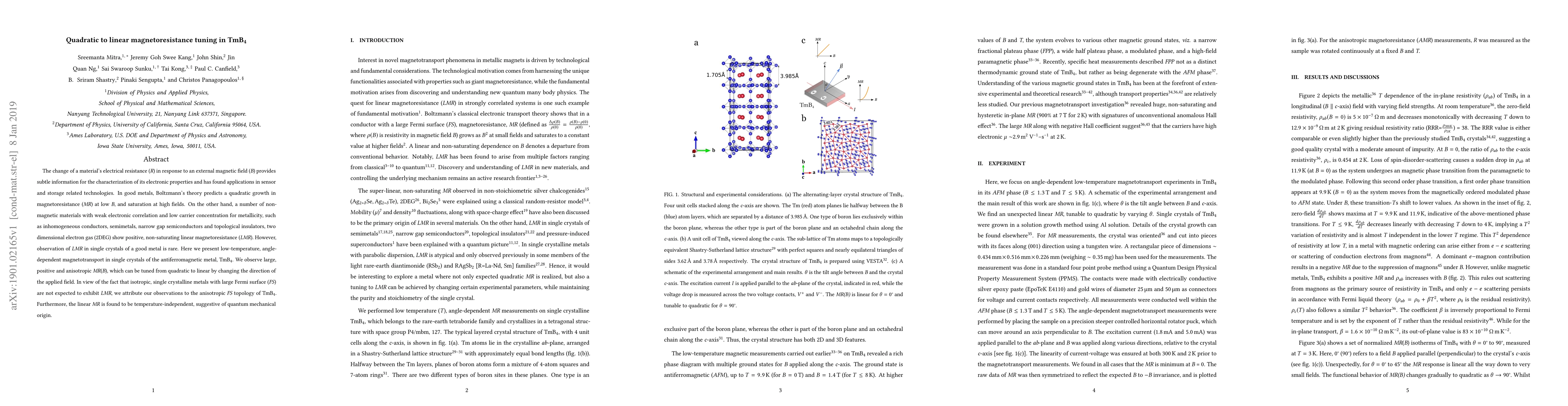 The change of a material's electrical resistance (R) in response to an external magnetic field (B) provides subtle information for the characterization of its electronic properties and has found applications in sensor and storage related technologies. In good metals, Boltzmann's theory predicts a quadratic growth in magnetoresistance (MR) at low B, and saturation at high fields. On the other hand, a number of nonmagnetic materials with weak electronic correlation and low carrier concentration for metallicity, such as inhomogeneous conductors, semimetals, narrow gap semiconductors and topological insulators, two-dimensional electron gas (2DEG) show positive, non-saturating linear magnetoresistance (LMR). However, observation of LMR in single crystals of a good metal is rare. Here we present low-temperature, angle dependent magnetotransport in single crystals of the antiferromagnetic metal, TmB4. We observe large, positive and anisotropic MR(B), which can be tuned from quadratic to linear by changing the direction of the applied field. In view of the fact that isotropic, single crystalline metals with large Fermi surface (FS) are not expected to exhibit LMR, we attribute our observations to the anisotropic FS topology of TmB4. Furthermore, the linear MR is found to be temperature-independent, suggestive of quantum mechanical origin.