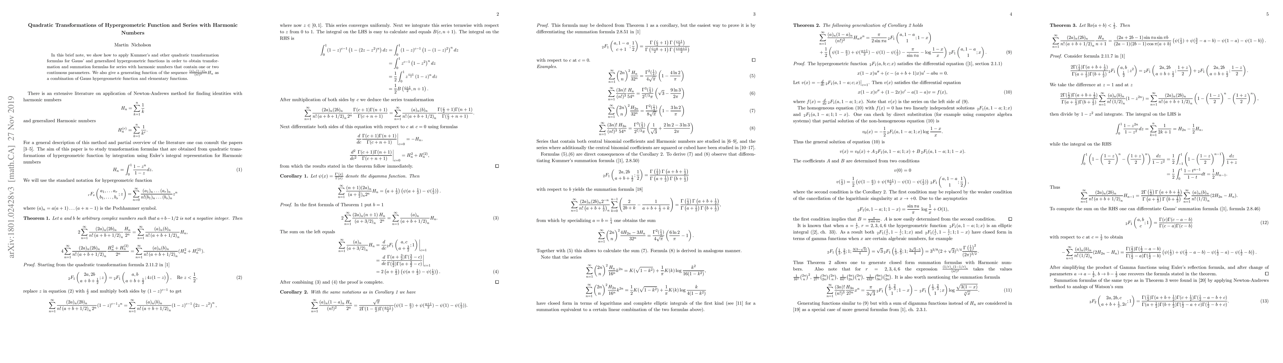 This paper demonstrates the application of quadratic transformation formulas for hypergeometric functions to derive transformation and summation formulas for series involving harmonic numbers, with continuous parameters. It also presents a generating function combining Gauss hypergeometric functions and elementary functions for the sequence $\frac{(a)_n (1-a)_n}{(n!)^2}H_n$.