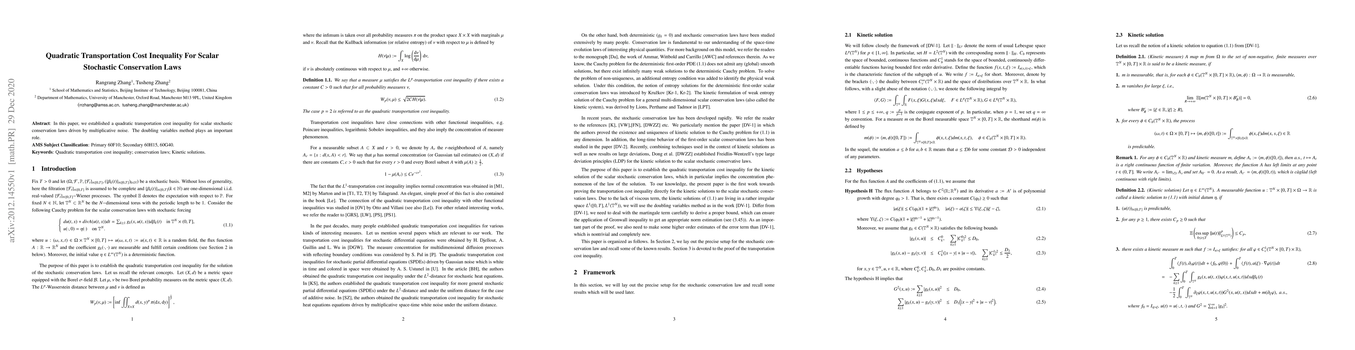 Summary: This paper establishes a quadratic transportation cost inequality for scalar stochastic conservation laws influenced by multiplicative noise, utilizing the doubling variables method to achieve the result.