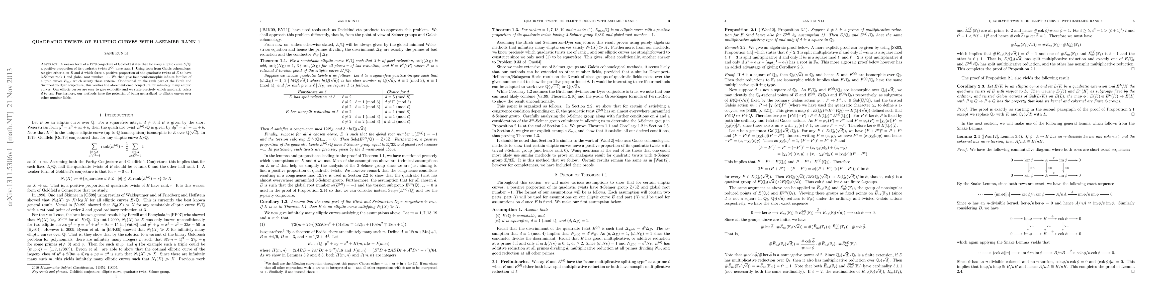 A weaker form of a 1979 conjecture of Goldfeld states that for every elliptic curve $E/\mathbb{Q}$, a positive proportion of its quadratic twists $E^{(d)}$ have rank 1. Using tools from Galois cohomology, we give criteria on E and d which force a positive proportion of the quadratic twists of E to have 3-Selmer rank 1 and global root number -1. We then give four nonisomorphic infinite families of elliptic curves $E_{m, n}$ which satisfy these criteria. Conditional on the rank part of the Birch and Swinnerton-Dyer conjecture, this verifies the aforementioned conjecture for infinitely many elliptic curves. Our elliptic curves are easy to give explicitly and we state precisely which quadratic twists d to use. Furthermore, our methods have the potential of being generalized to elliptic curves over other number fields.