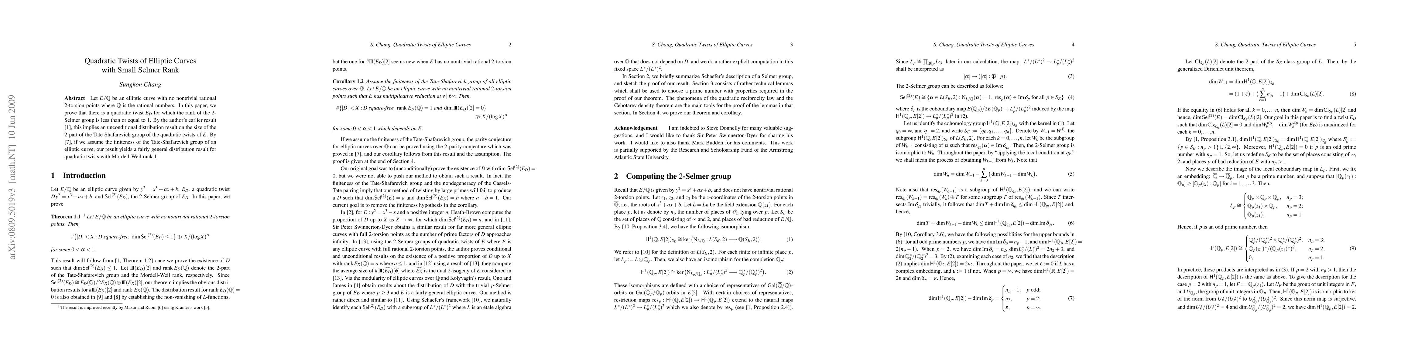 A combination of number theory and algebraic geometry techniques were used to study the Selmer groups of quadratic twists of elliptic curves.
