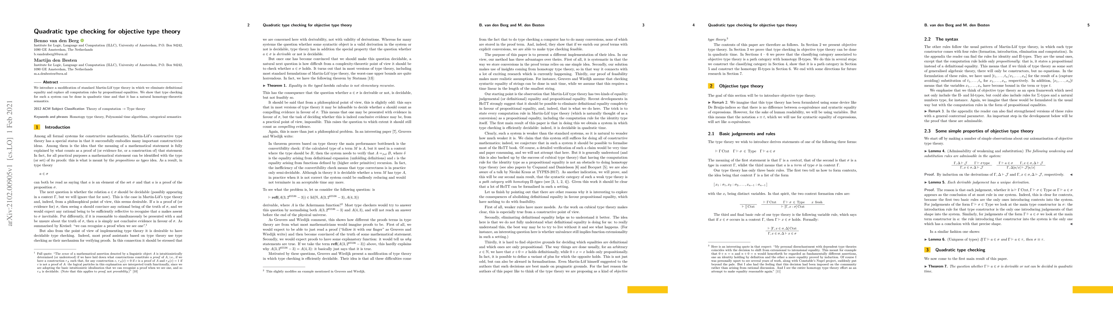 This research paper introduces a modified type theory that replaces computation rules with propositional equalities, enabling quadratic-time type checking and a natural homotopy-theoretic semantics.