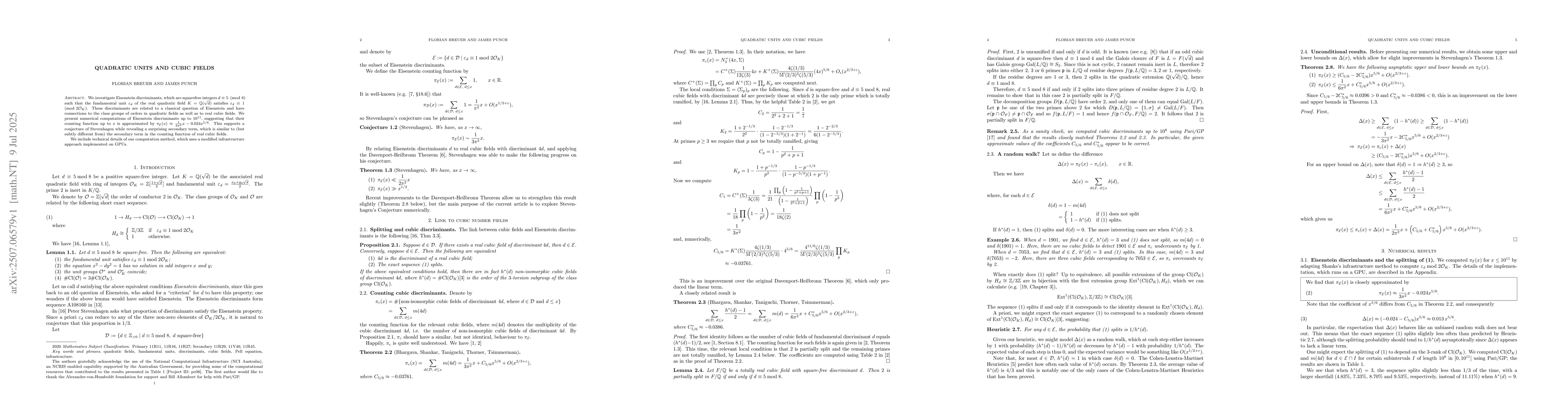 We investigate Eisenstein discriminants, which are squarefree integers $d \equiv 5 \pmod{8}$ such that the fundamental unit $\varepsilon_d$ of the real quadratic field $K=\mathbb{Q}(\sqrt{d})$ satisfies $\varepsilon_d \equiv 1 \pmod{2\mathcal{O}_K}$. These discriminants are related to a classical question of Eisenstein and have connections to the class groups of orders in quadratic fields as well as to real cubic fields. We present numerical computations of Eisenstein discriminants up to $10^{11}$, suggesting that their counting function up to $x$ is approximated by $\pi_{\mathcal{E}}(x) \approx \frac{1}{3\pi^2}x - 0.024x^{5/6}$. This supports a conjecture of Stevenhagen while revealing a surprising secondary term, which is similar to (but subtly different from) the secondary term in the counting function of real cubic fields. We include technical details of our computation method, which uses a modified infrastructure approach implemented on GPUs.