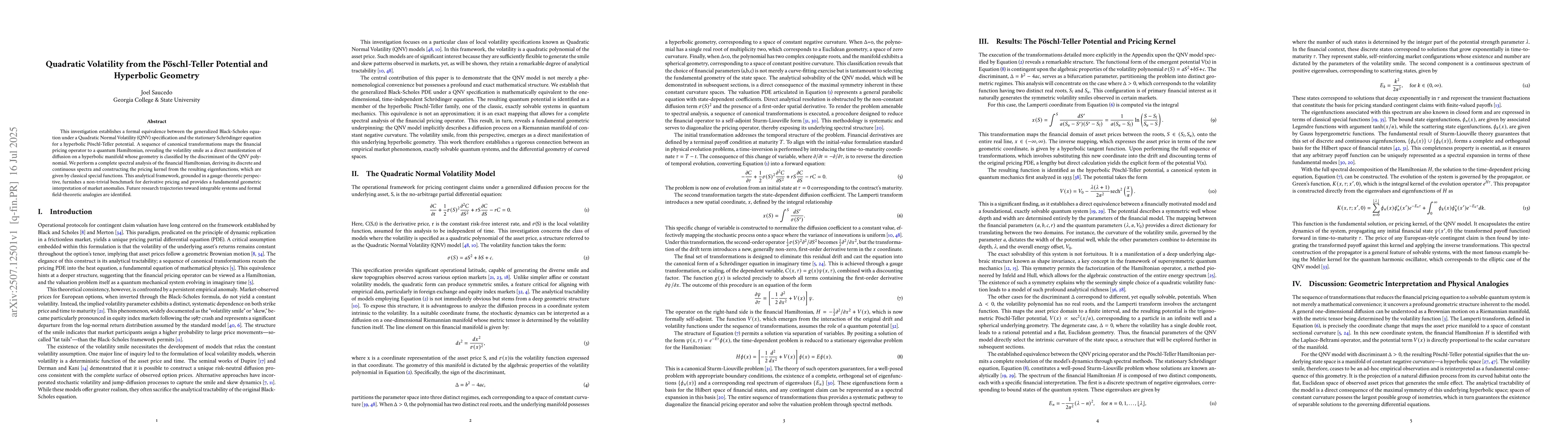 This investigation establishes a formal equivalence between the generalized Black-Scholes equation under a Quadratic Normal Volatility (QNV) specification and the stationary Schr\"odinger equation for a hyperbolic P\"oschl-Teller potential. A sequence of canonical transformations maps the financial pricing operator to a quantum Hamiltonian, revealing the volatility smile as a direct manifestation of diffusion on a hyperbolic manifold whose geometry is classified by the discriminant of the QNV polynomial. We perform a complete spectral analysis of the financial Hamiltonian, deriving its discrete and continuous spectra and constructing the pricing kernel from the resulting eigenfunctions, which are given by classical special functions. This analytical framework, grounded in a gauge-theoretic perspective, furnishes a non-trivial benchmark for derivative pricing and provides a fundamental geometric interpretation of market anomalies. Future research trajectories toward integrable systems and formal field-theoretic analogies are identified.