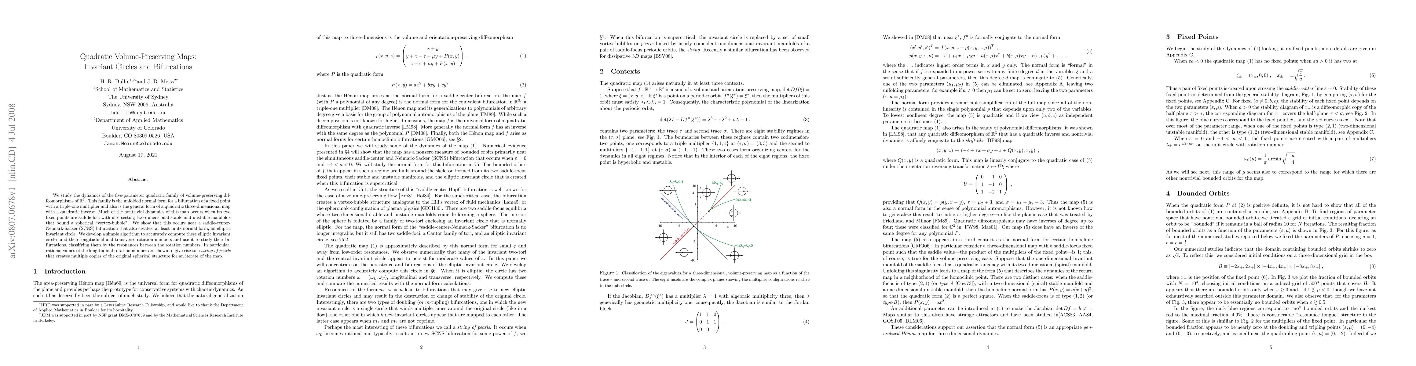 We study the dynamics of the five-parameter quadratic family of volume-preserving diffeomorphisms of R^3. This family is the unfolded normal form for a bifurcation of a fixed point with a triple-one multiplier and also is the general form of a quadratic three-dimensional map with a quadratic inverse. Much of the nontrivial dynamics of this map occurs when its two fixed points are saddle-foci with intersecting two-dimensional stable and unstable manifolds that bound a spherical ``vortex-bubble''. We show that this occurs near a saddle-center-Neimark-Sacker (SCNS) bifurcation that also creates, at least in its normal form, an elliptic invariant circle. We develop a simple algorithm to accurately compute these elliptic invariant circles and their longitudinal and transverse rotation numbers and use it to study their bifurcations, classifying them by the resonances between the rotation numbers. In particular, rational values of the longitudinal rotation number are shown to give rise to a string of pearls that creates multiple copies of the original spherical structure for an iterate of the map.