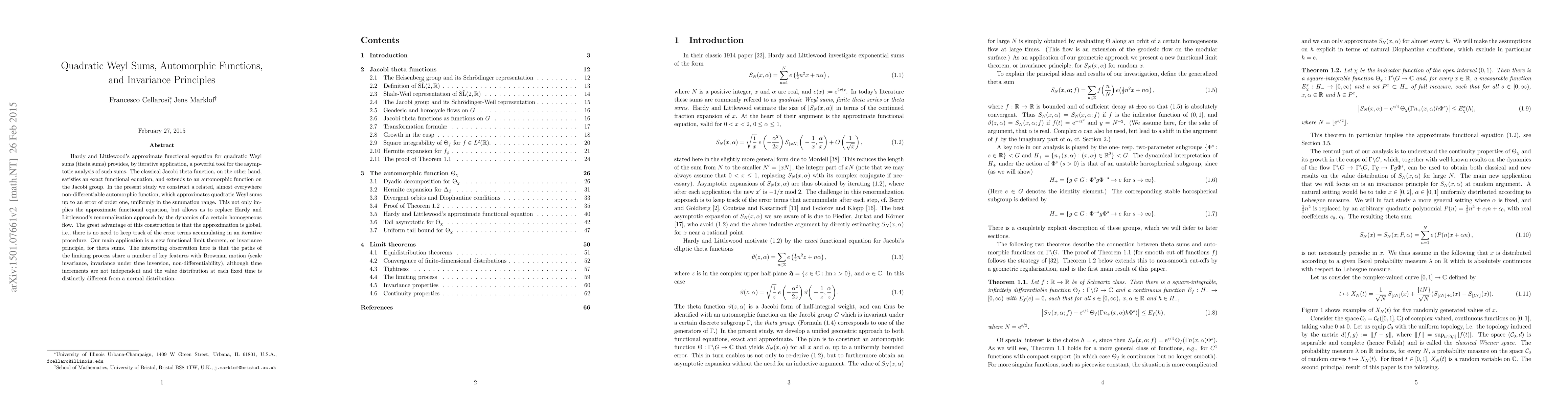 Hardy and Littlewood's approximate functional equation for quadratic Weyl sums (theta sums) provides, by iterative application, a powerful tool for the asymptotic analysis of such sums. The classical Jacobi theta function, on the other hand, satisfies an exact functional equation, and extends to an automorphic function on the Jacobi group. In the present study we construct a related, almost everywhere non-differentiable automorphic function, which approximates quadratic Weyl sums up to an error of order one, uniformly in the summation range. This not only implies the approximate functional equation, but allows us to replace Hardy and Littlewood's renormalization approach by the dynamics of a certain homogeneous flow. The great advantage of this construction is that the approximation is global, i.e., there is no need to keep track of the error terms accumulating in an iterative procedure. Our main application is a new functional limit theorem, or invariance principle, for theta sums. The interesting observation here is that the paths of the limiting process share a number of key features with Brownian motion (scale invariance, invariance under time inversion, non-differentiability), although time increments are not independent and the value distribution at each fixed time is distinctly different from a normal distribution.