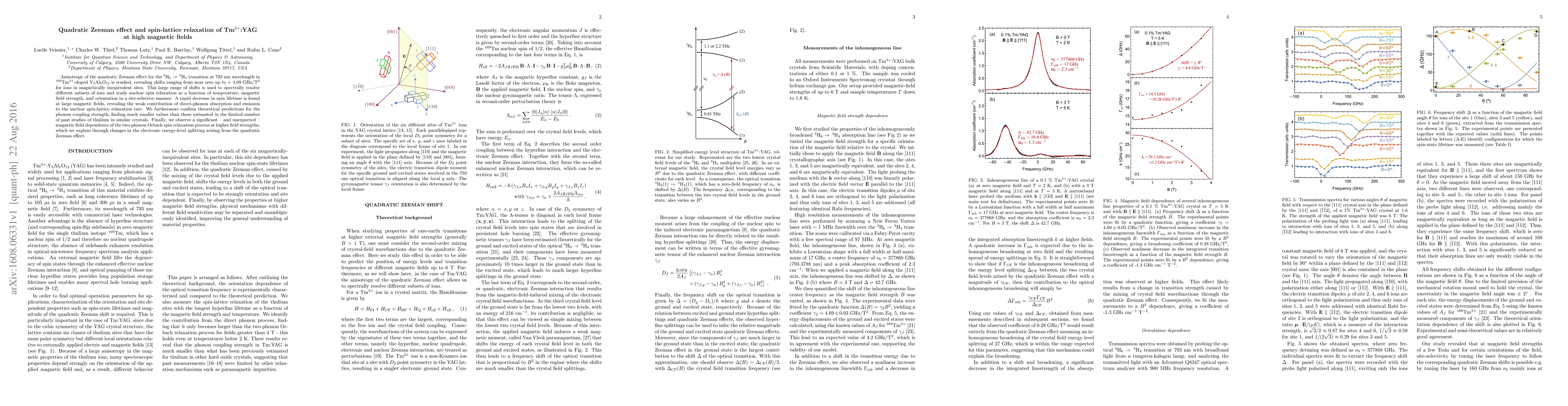 Anisotropy of the quadratic Zeeman effect for the $^3{\rm H}_6 \rightarrow \, ^3{\rm H}_4$ transition at 793 nm wavelength in $^{169}$Tm$^{3+}$-doped Y$_3$Al$_5$O$_{12}$ is studied, revealing shifts ranging from near zero up to + 4.69 GHz/T$^2$ for ions in magnetically inequivalent sites. This large range of shifts is used to spectrally resolve different subsets of ions and study nuclear spin relaxation as a function of temperature, magnetic field strength, and orientation in a site-selective manner. A rapid decrease in spin lifetime is found at large magnetic fields, revealing the weak contribution of direct-phonon absorption and emission to the nuclear spin-lattice relaxation rate. We furthermore confirm theoretical predictions for the phonon coupling strength, finding much smaller values than those estimated in the limited number of past studies of thulium in similar crystals. Finally, we observe a significant -- and unexpected -- magnetic field dependence of the two-phonon Orbach spin relaxation process at higher field strengths, which we explain through changes in the electronic energy-level splitting arising from the quadratic Zeeman effect.
