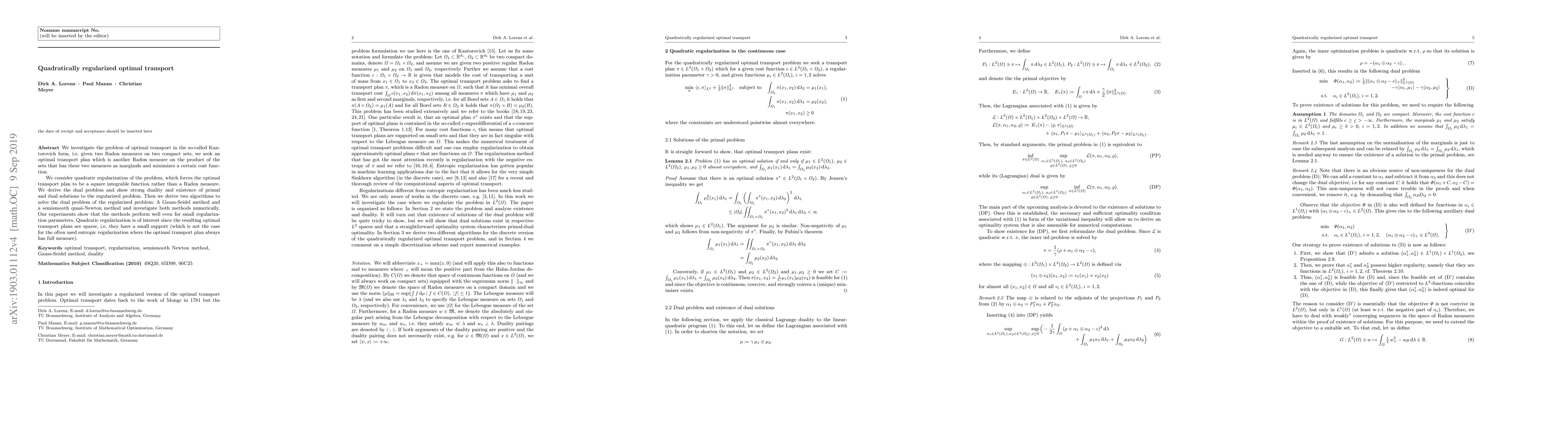 This paper studies the optimal transport problem with quadratic regularization, deriving the dual problem and proving strong duality. It proposes two algorithms—Gauss-Seidel and semismooth quasi-Newton—to solve the dual problem and demonstrates their effectiveness, highlighting the sparse nature of the resulting transport plans.