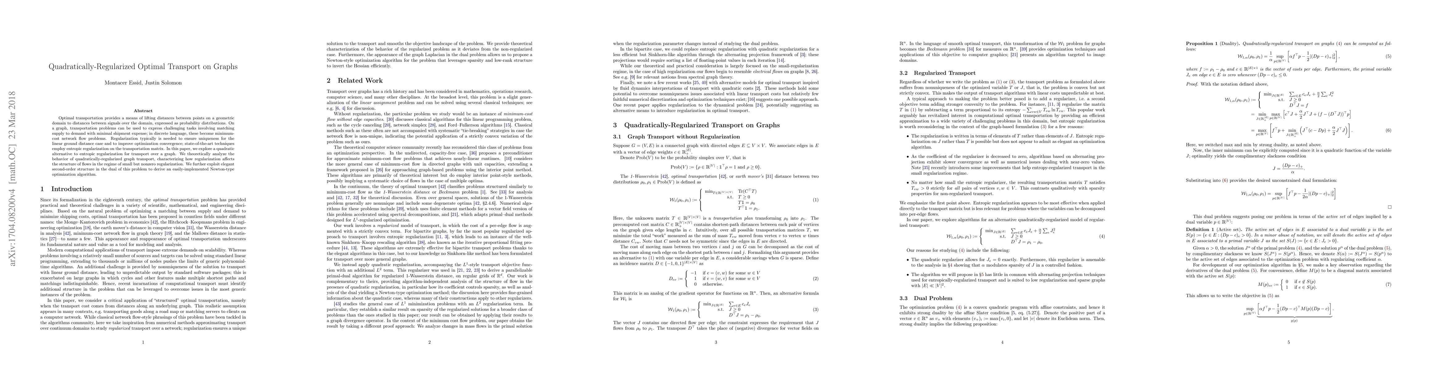 Optimal transportation provides a means of lifting distances between points on a geometric domain to distances between signals over the domain, expressed as probability distributions. On a graph, transportation problems can be used to express challenging tasks involving matching supply to demand with minimal shipment expense; in discrete language, these become minimum-cost network flow problems. Regularization typically is needed to ensure uniqueness for the linear ground distance case and to improve optimization convergence; state-of-the-art techniques employ entropic regularization on the transportation matrix. In this paper, we explore a quadratic alternative to entropic regularization for transport over a graph. We theoretically analyze the behavior of quadratically-regularized graph transport, characterizing how regularization affects the structure of flows in the regime of small but nonzero regularization. We further exploit elegant second-order structure in the dual of this problem to derive an easily-implemented Newton-type optimization algorithm.