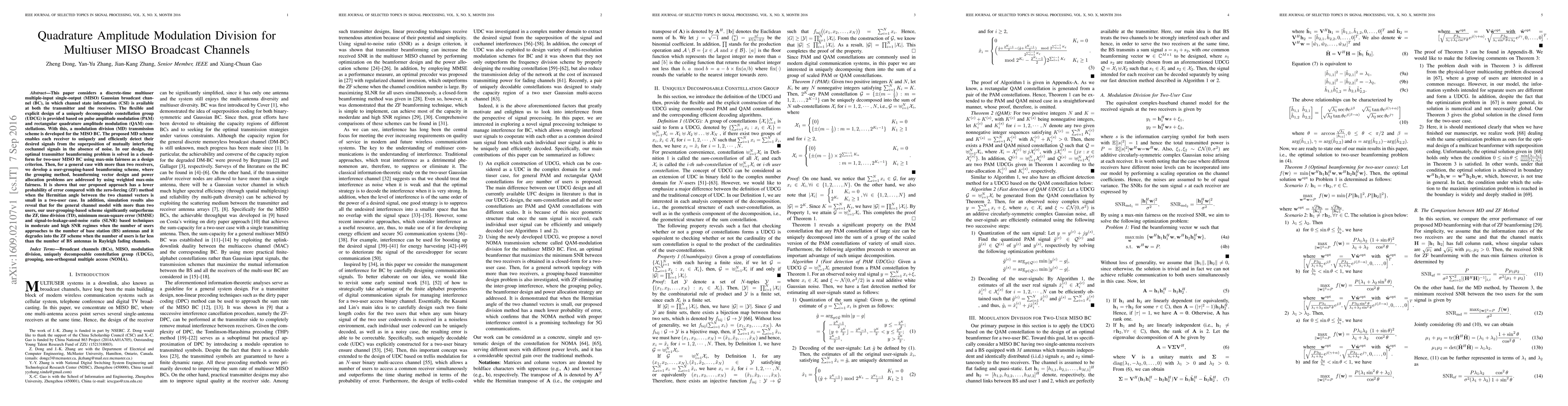 This paper proposes a modulation division transmission scheme for multiuser MISO broadcast channels, utilizing a uniquely decomposable constellation group based on PAM and QAM. The scheme enables efficient signal detection in the absence of noise, with optimal beamforming and user-grouping strategies that outperform conventional methods in terms of error probability and performance in various SNR regimes.