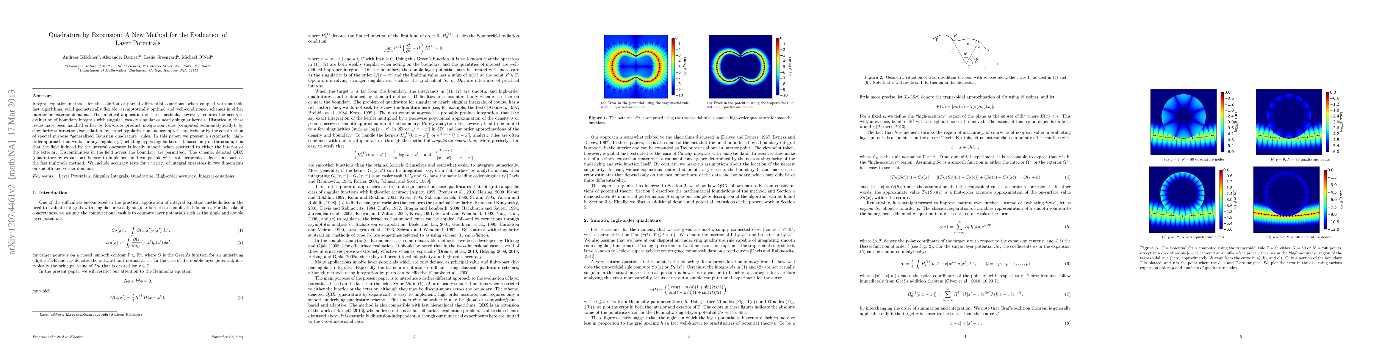 This paper introduces QBX, a new high-order quadrature method for evaluating layer potentials, which handles singular, weakly singular, and hypersingular kernels by assuming local smoothness of the field. QBX is easy to implement and compatible with fast hierarchical algorithms like the fast multipole method.