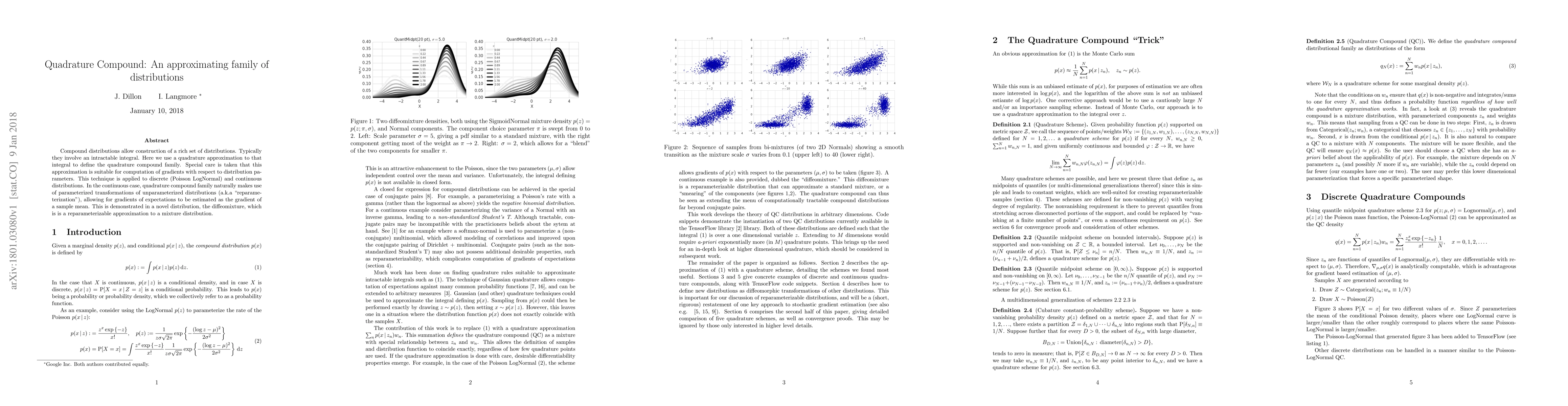 Compound distributions allow construction of a rich set of distributions. Typically they involve an intractable integral. Here we use a quadrature approximation to that integral to define the quadrature compound family. Special care is taken that this approximation is suitable for computation of gradients with respect to distribution parameters. This technique is applied to discrete (Poisson LogNormal) and continuous distributions. In the continuous case, quadrature compound family naturally makes use of parameterized transformations of unparameterized distributions (a.k.a "reparameterization"), allowing for gradients of expectations to be estimated as the gradient of a sample mean. This is demonstrated in a novel distribution, the diffeomixture, which is is a reparameterizable approximation to a mixture distribution.